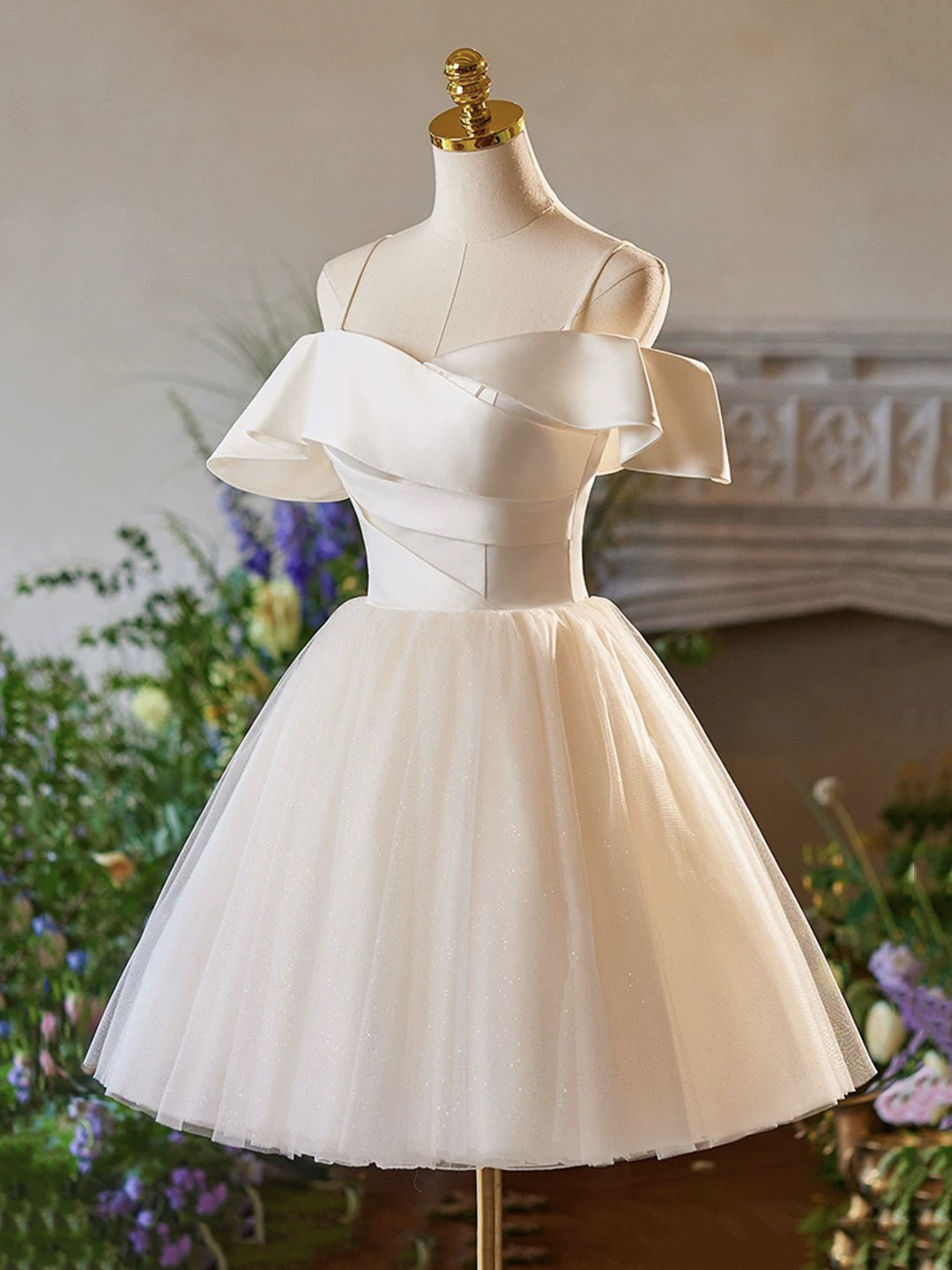 - Champagne Spaghetti Strap Tulle Knee Length Prom Dress -