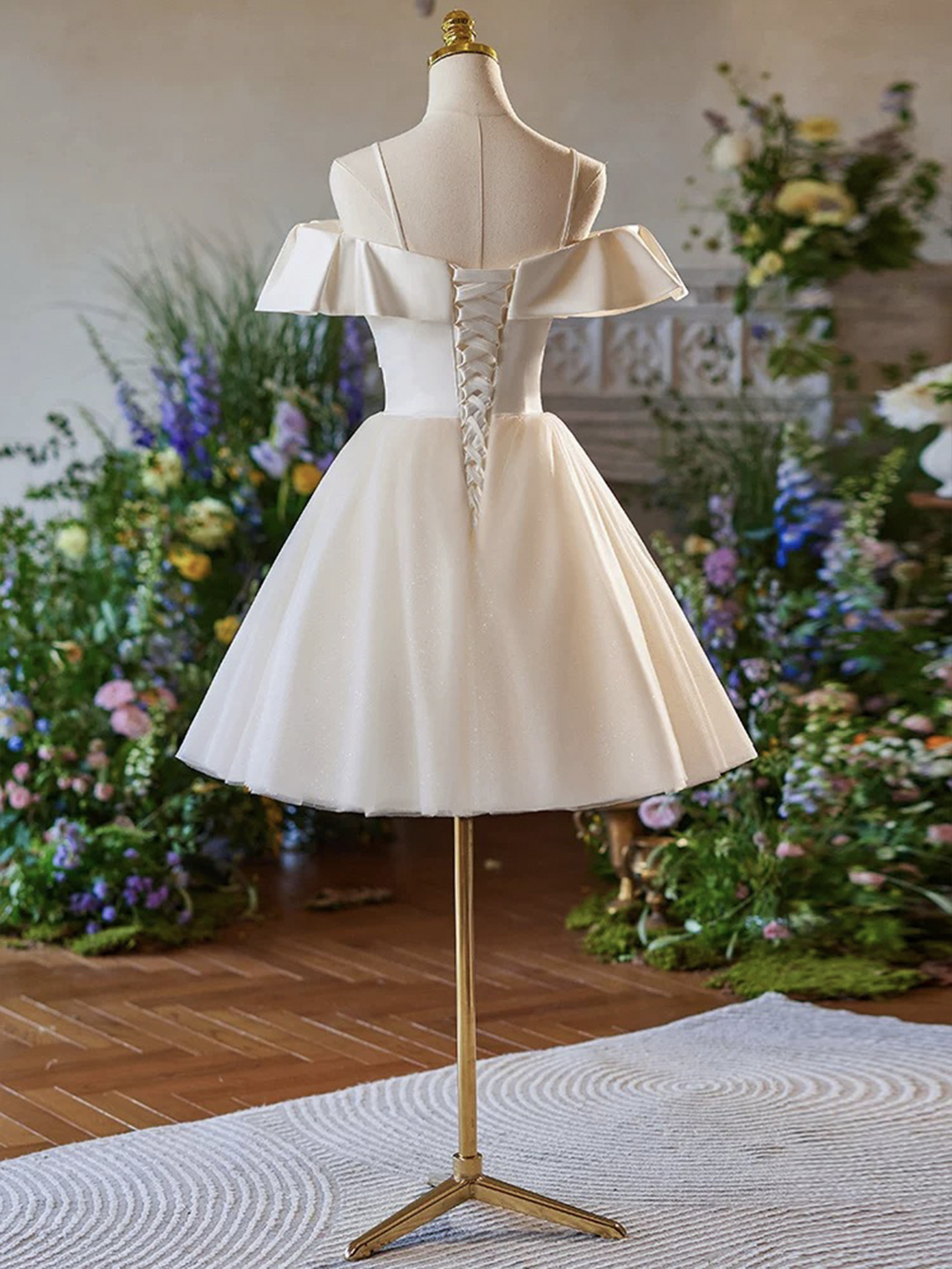 Champagne Spaghetti Strap Tulle Knee Length Prom Dress