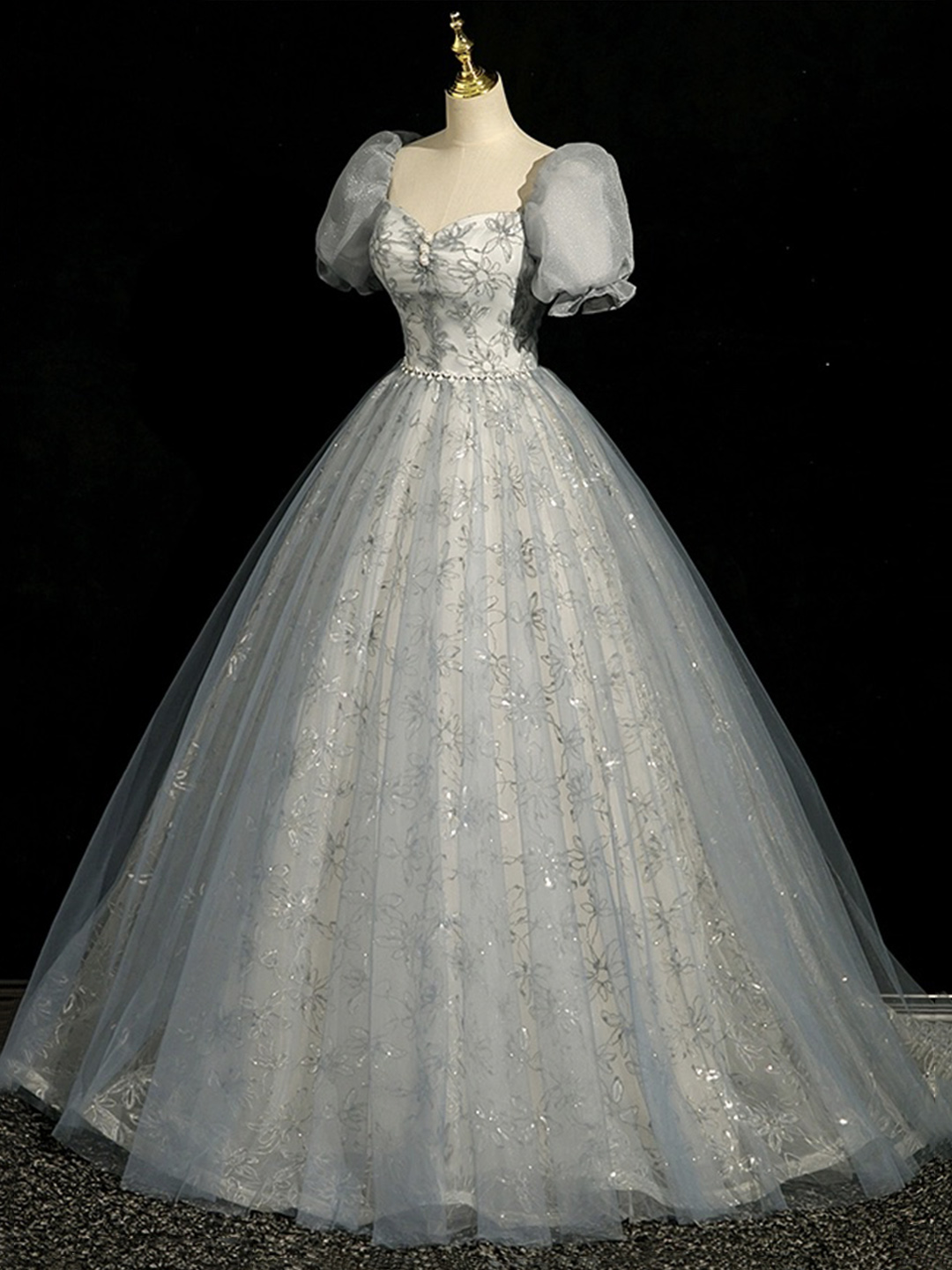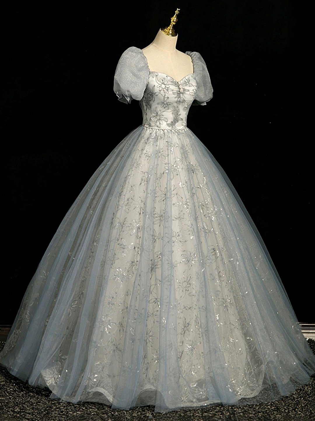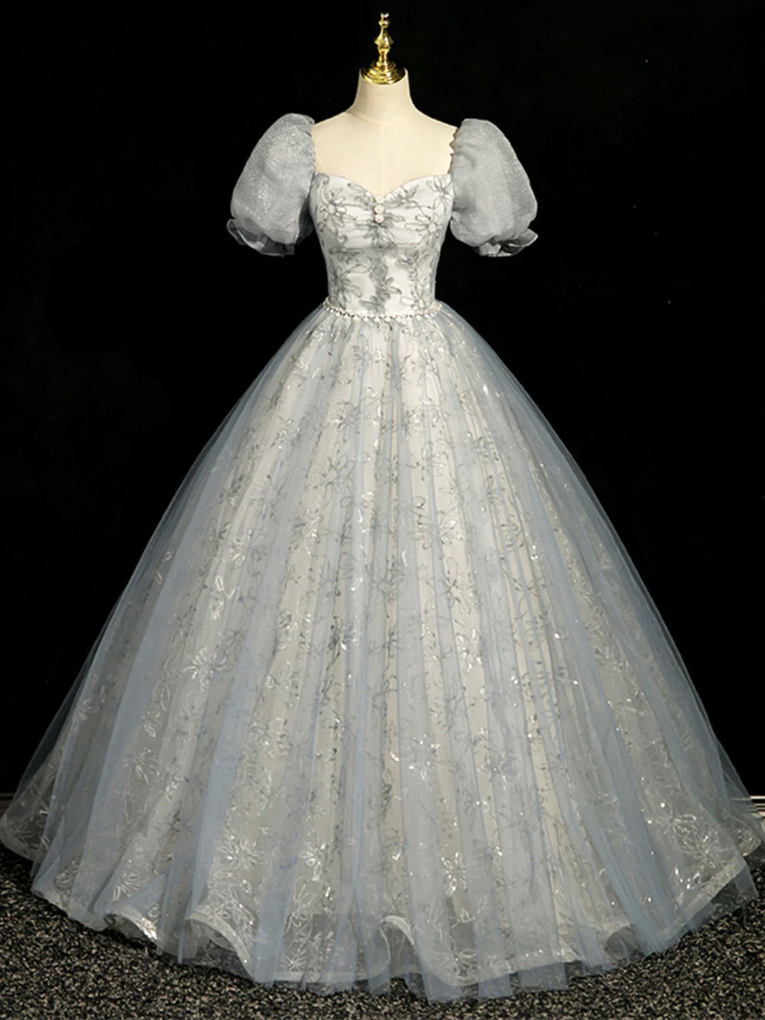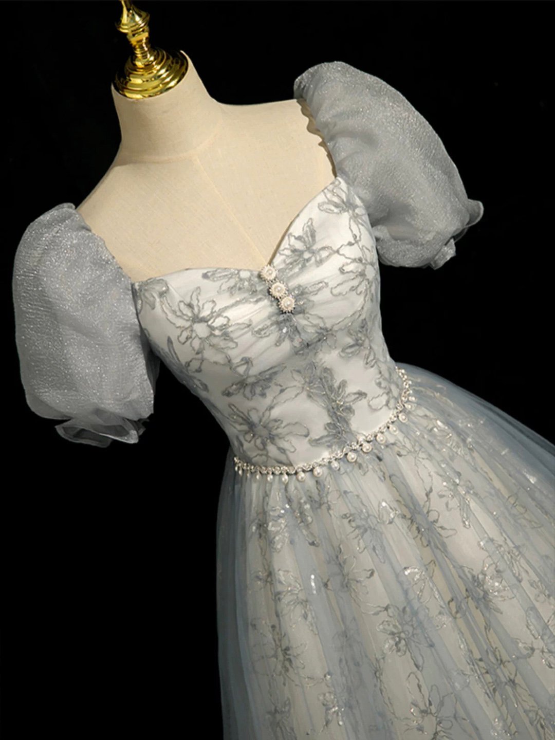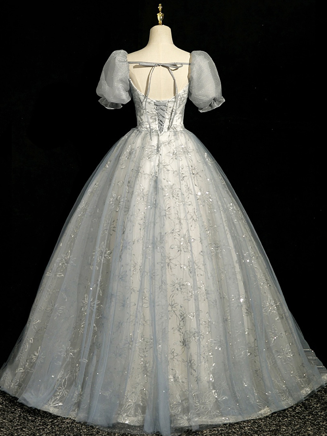 - Gray Tulle Lace Floor Length Prom Dress -