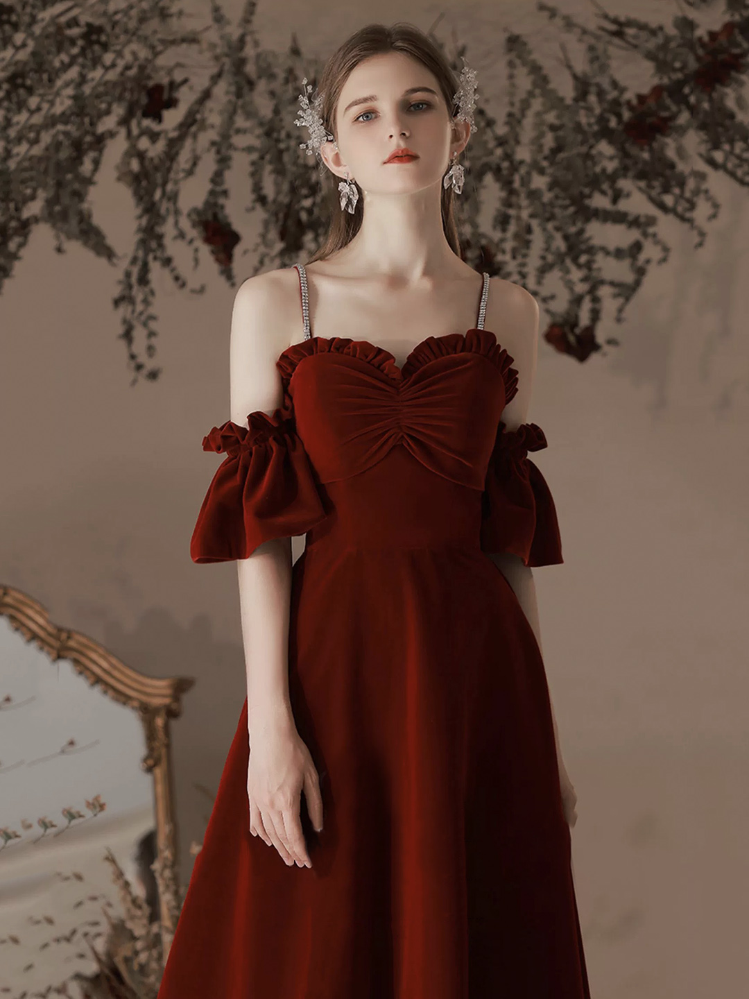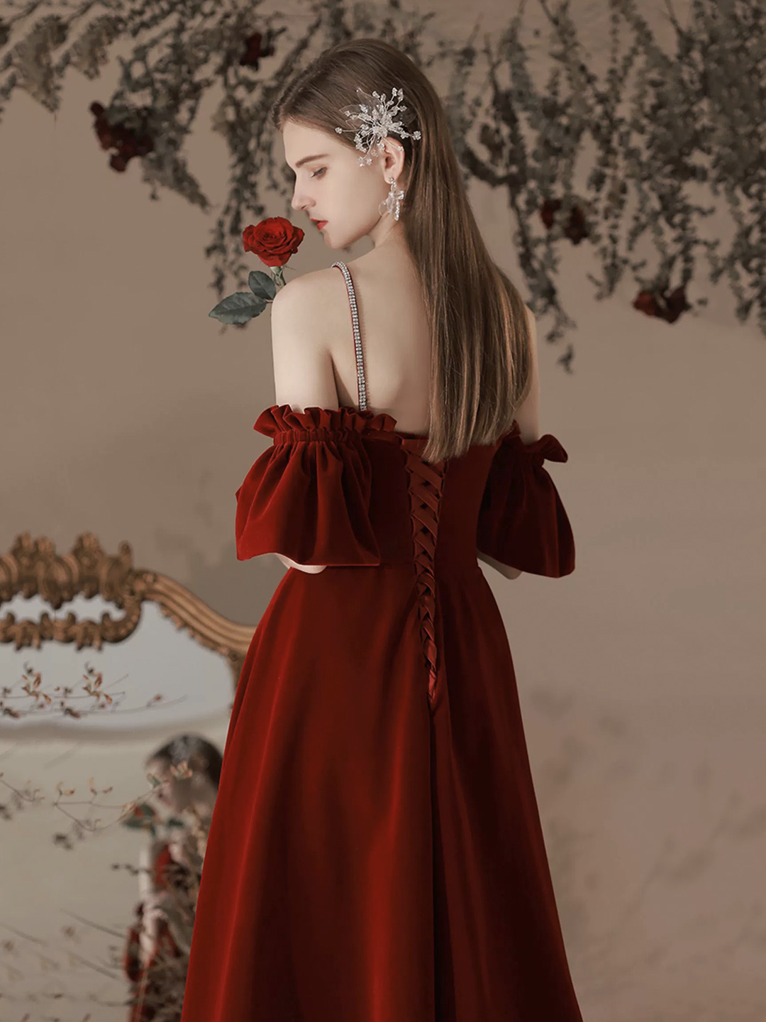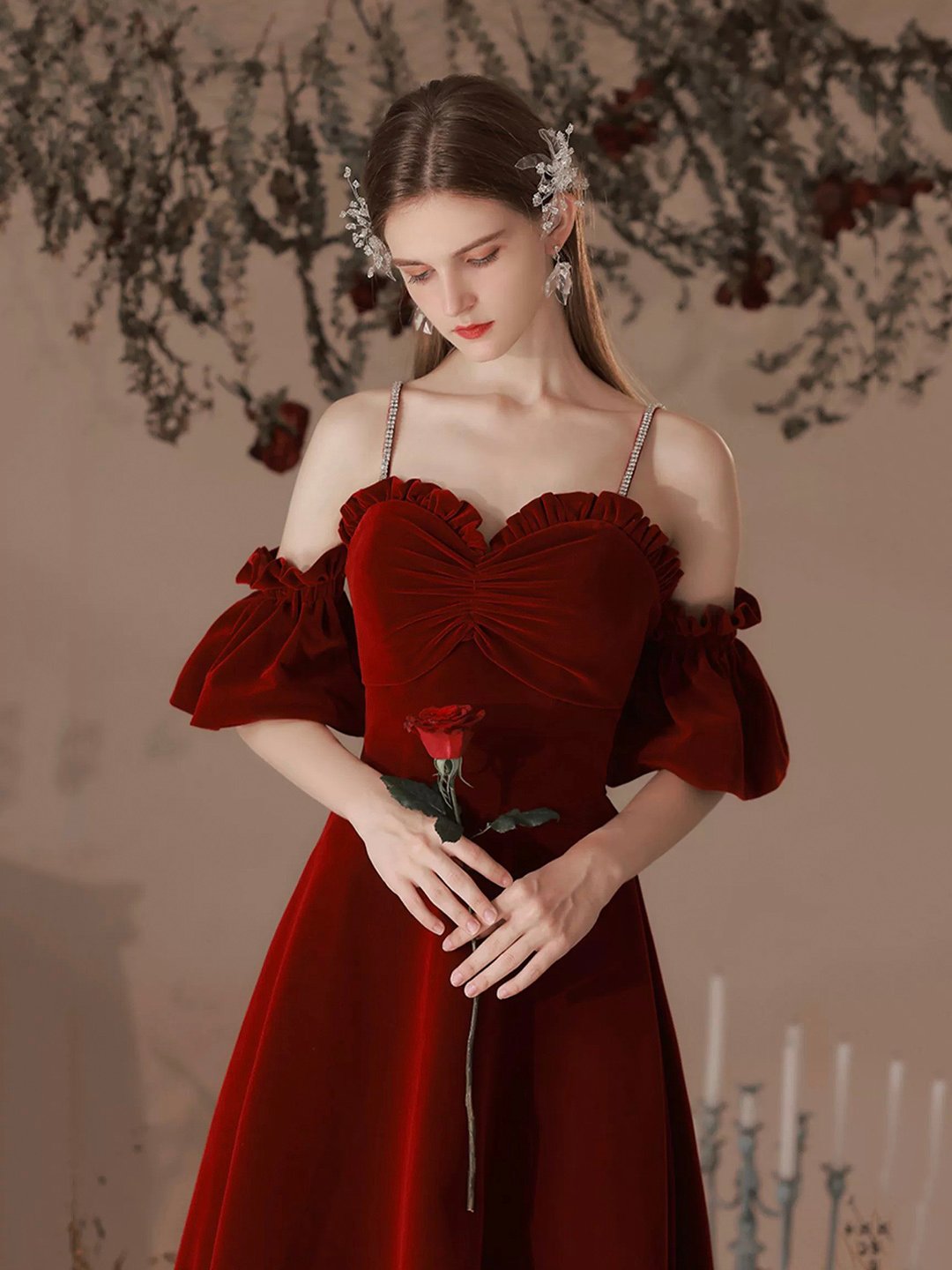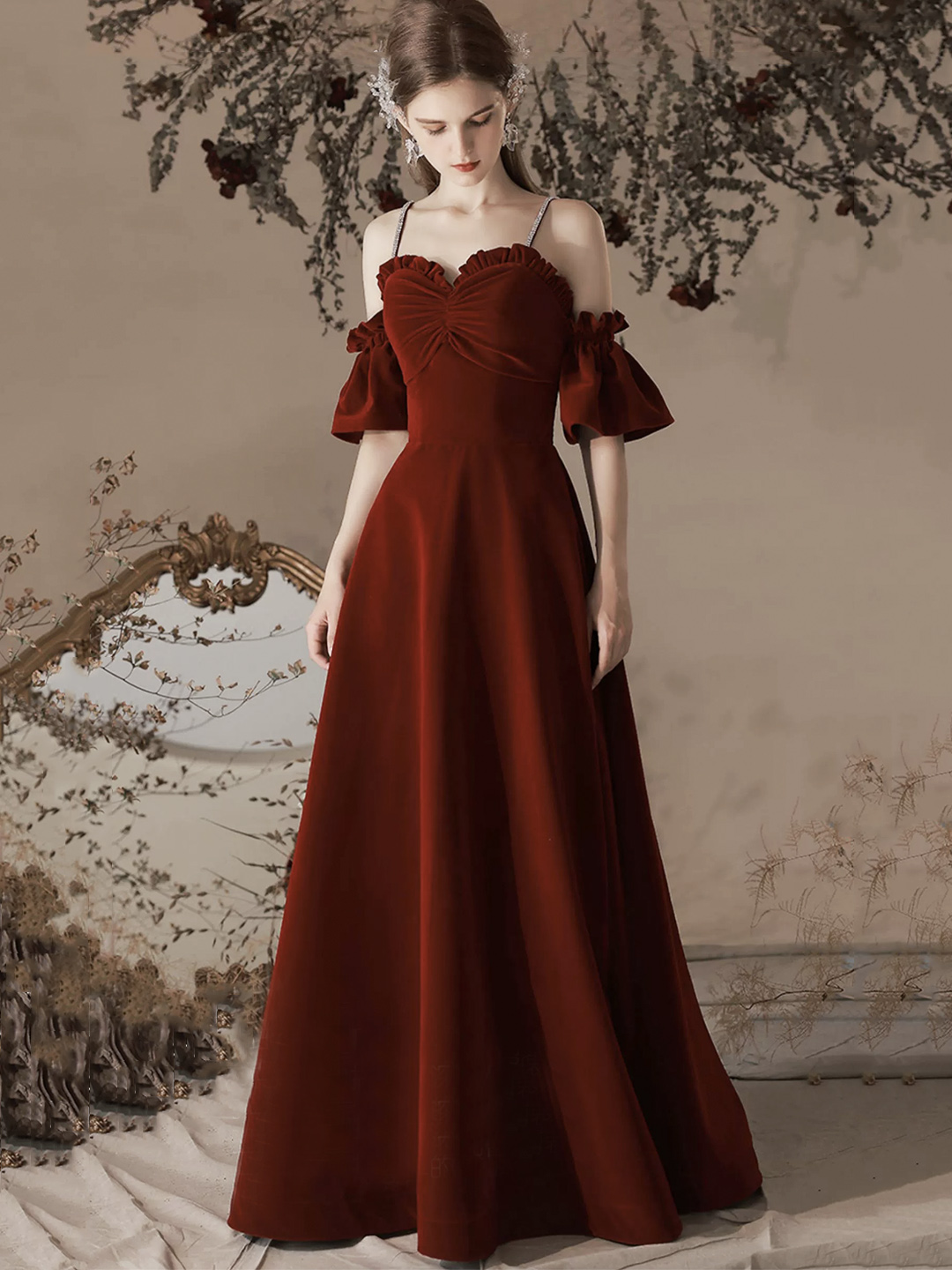 - Burgundy Velvet Long A-Line Prom Party Dresses -