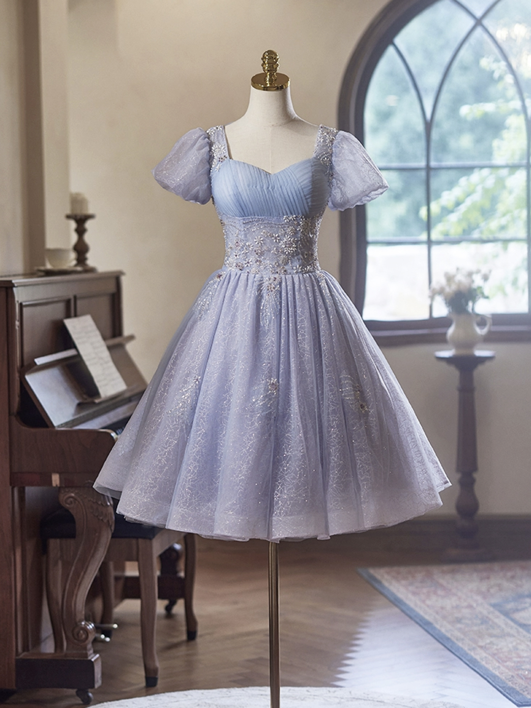 - Light Purple Tulle Knee Length Party Dress, A-Line Short Sleeve Evening Dress -
