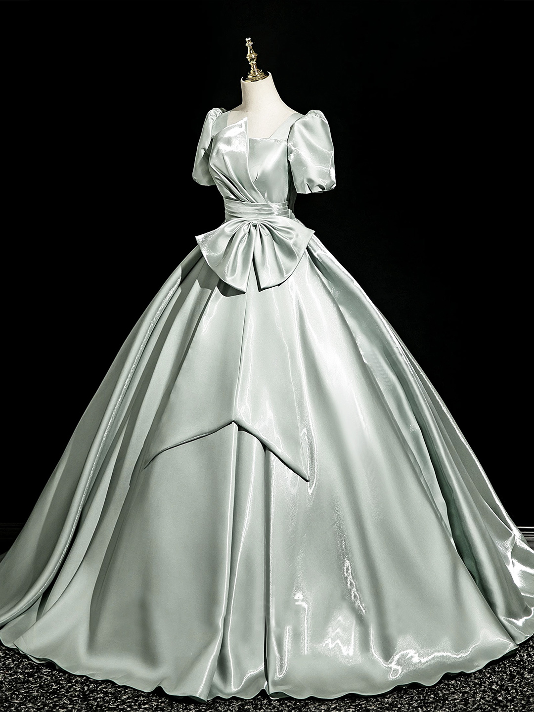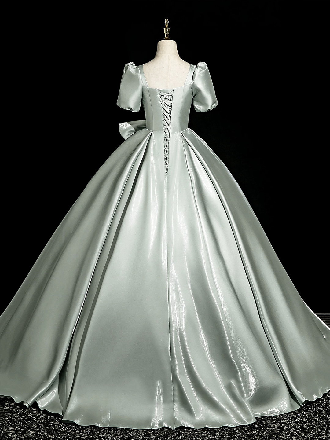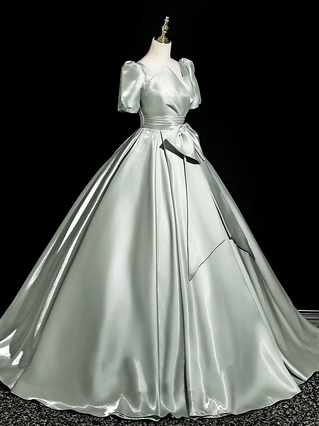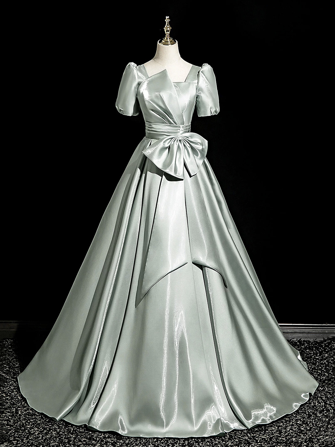 - Green Satin Floor Length Prom Dress, Elegant Short Sleeve Party Dress -