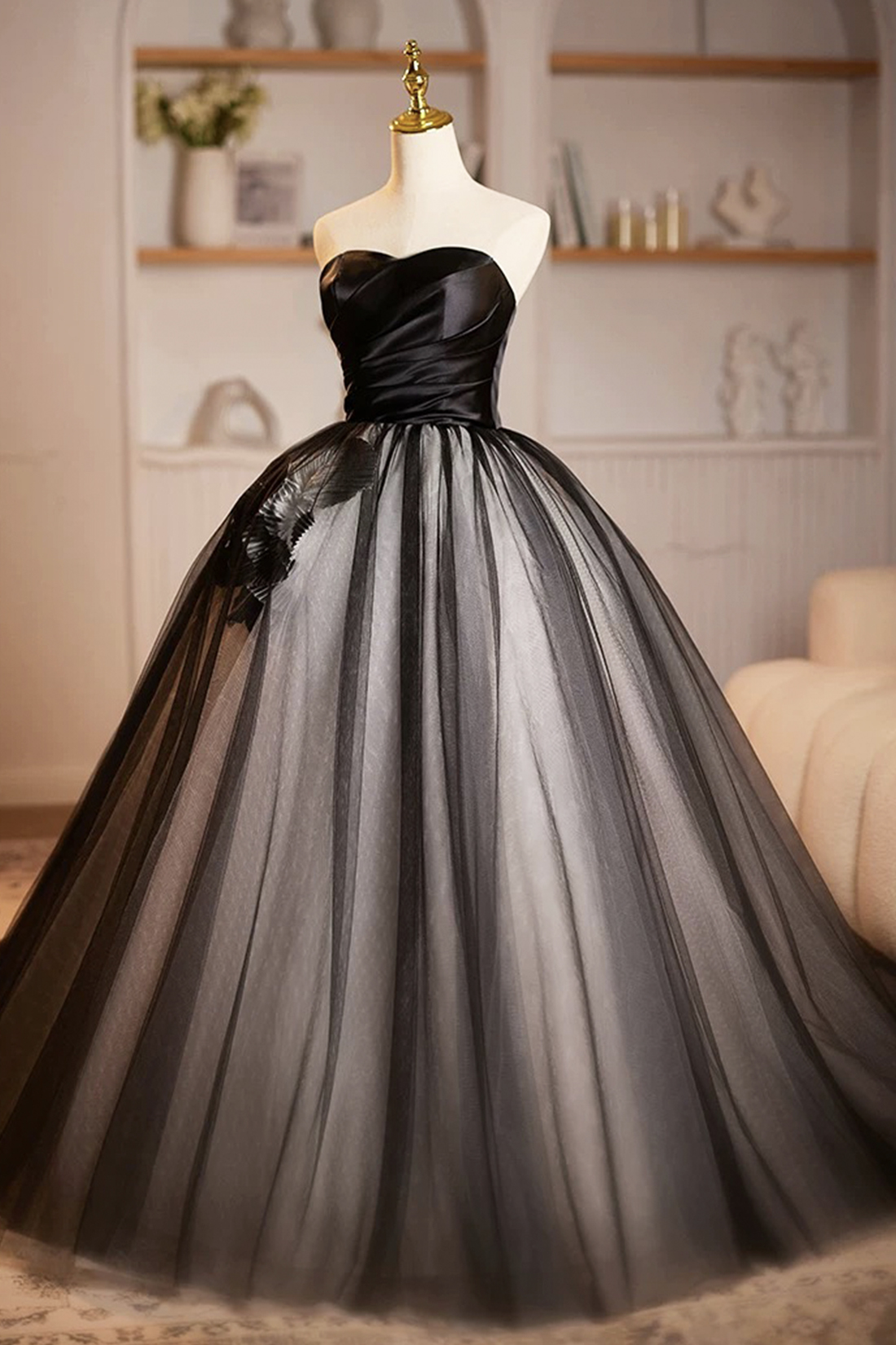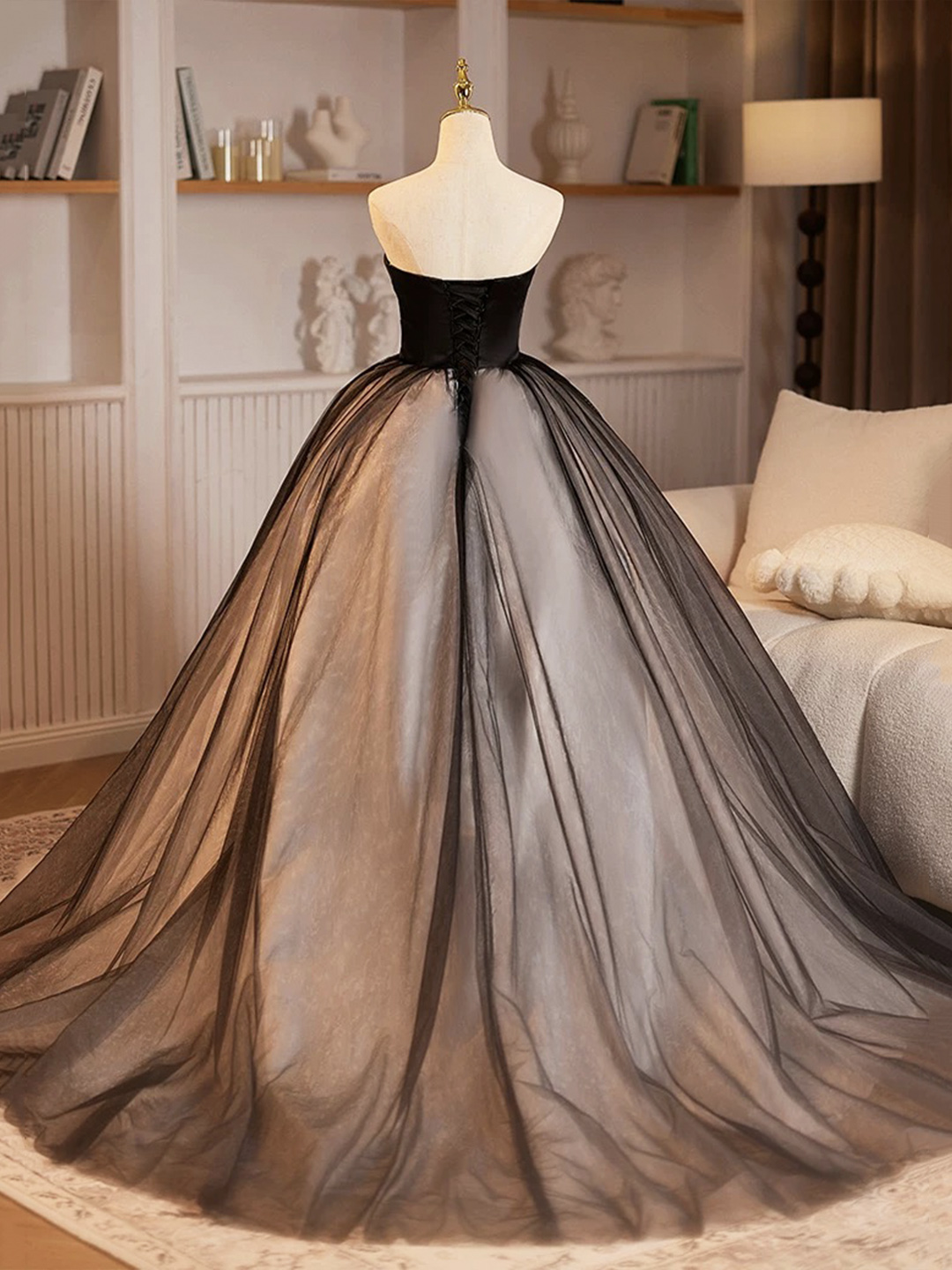 - Black Satin Tulle Long Prom Dress, A-Line Evening Party Dress -