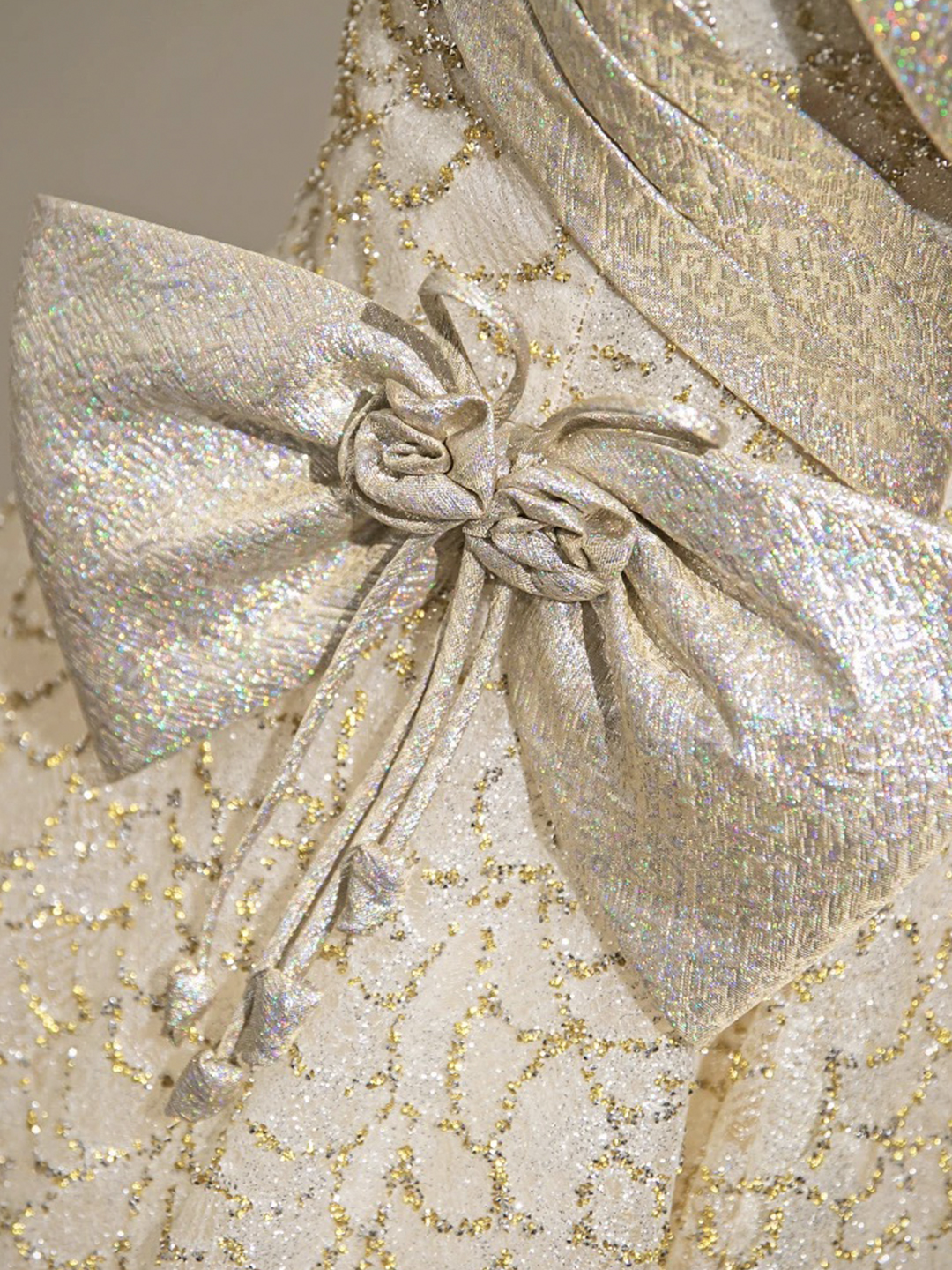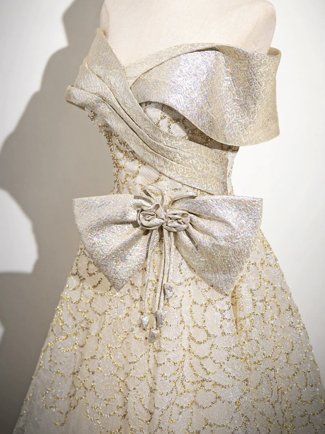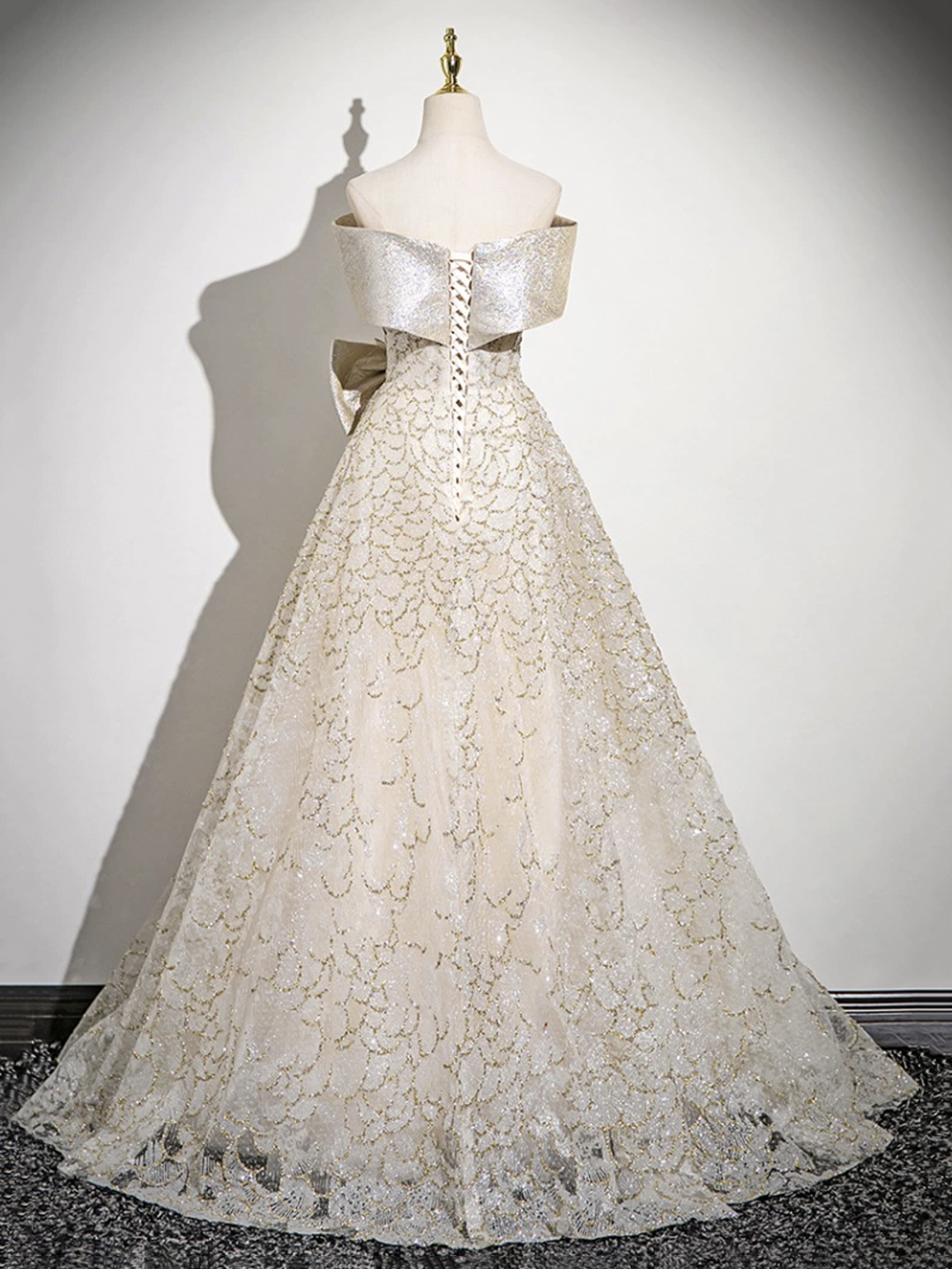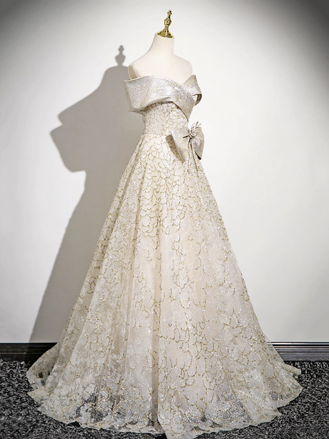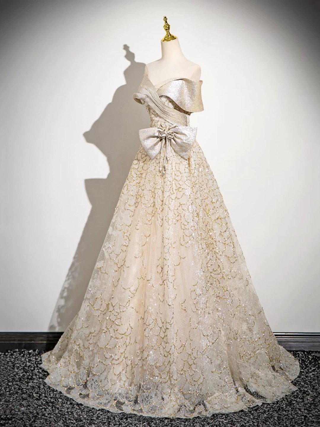 - Champagne Tulle Sequins Long Prom Dress, Off the Shoulder Evening Party Dress -