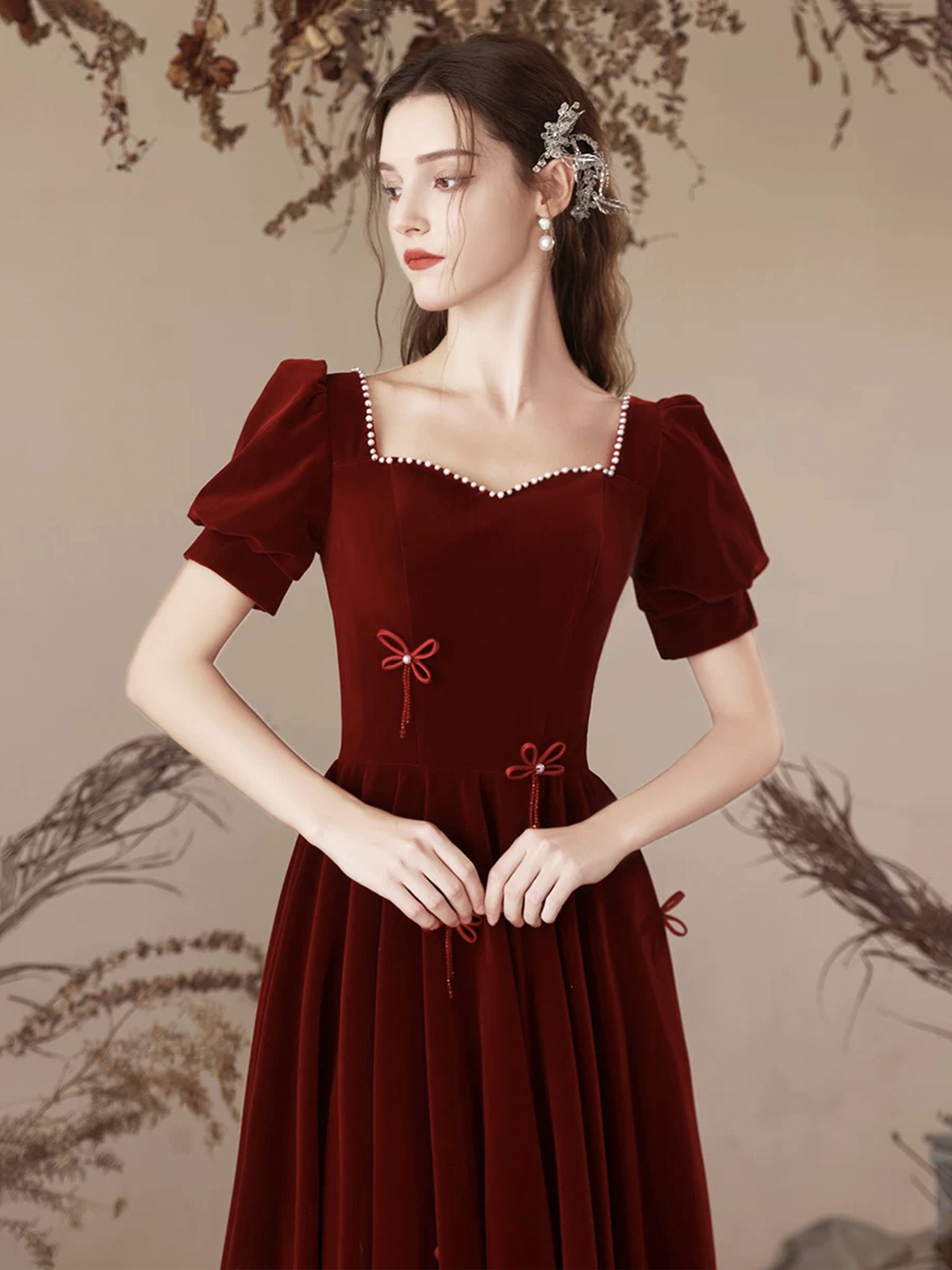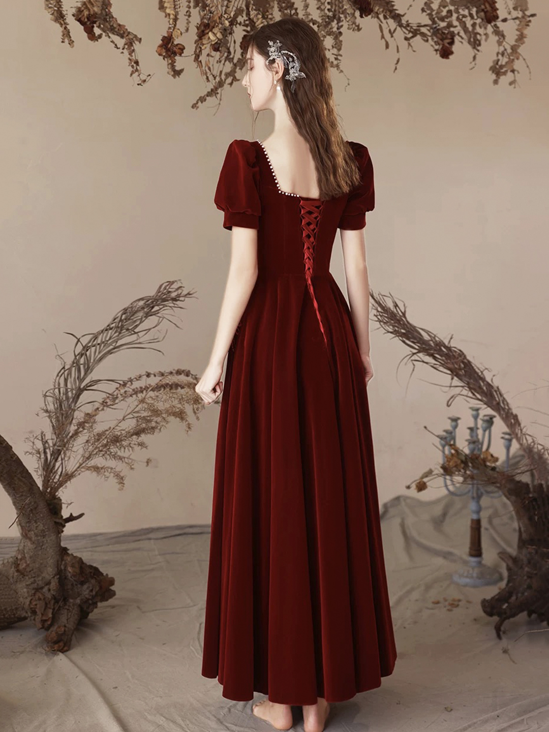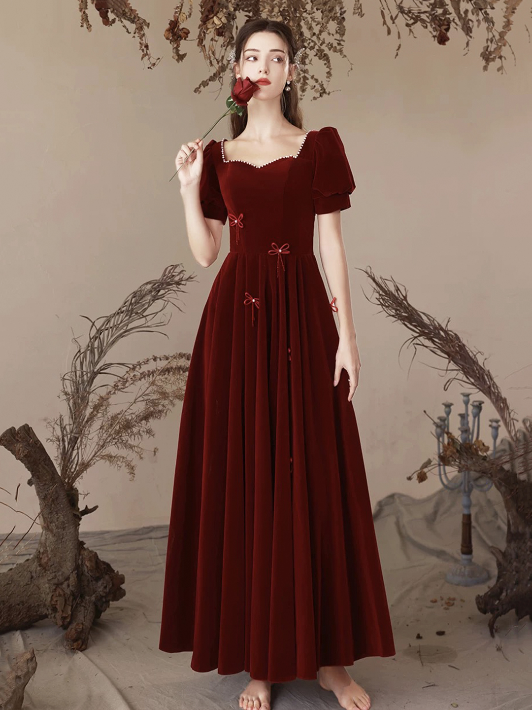 - Burgundy Velvet Long Party Prom Dress -