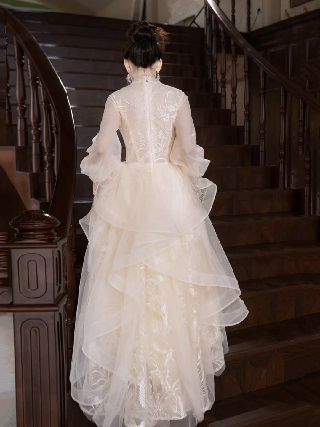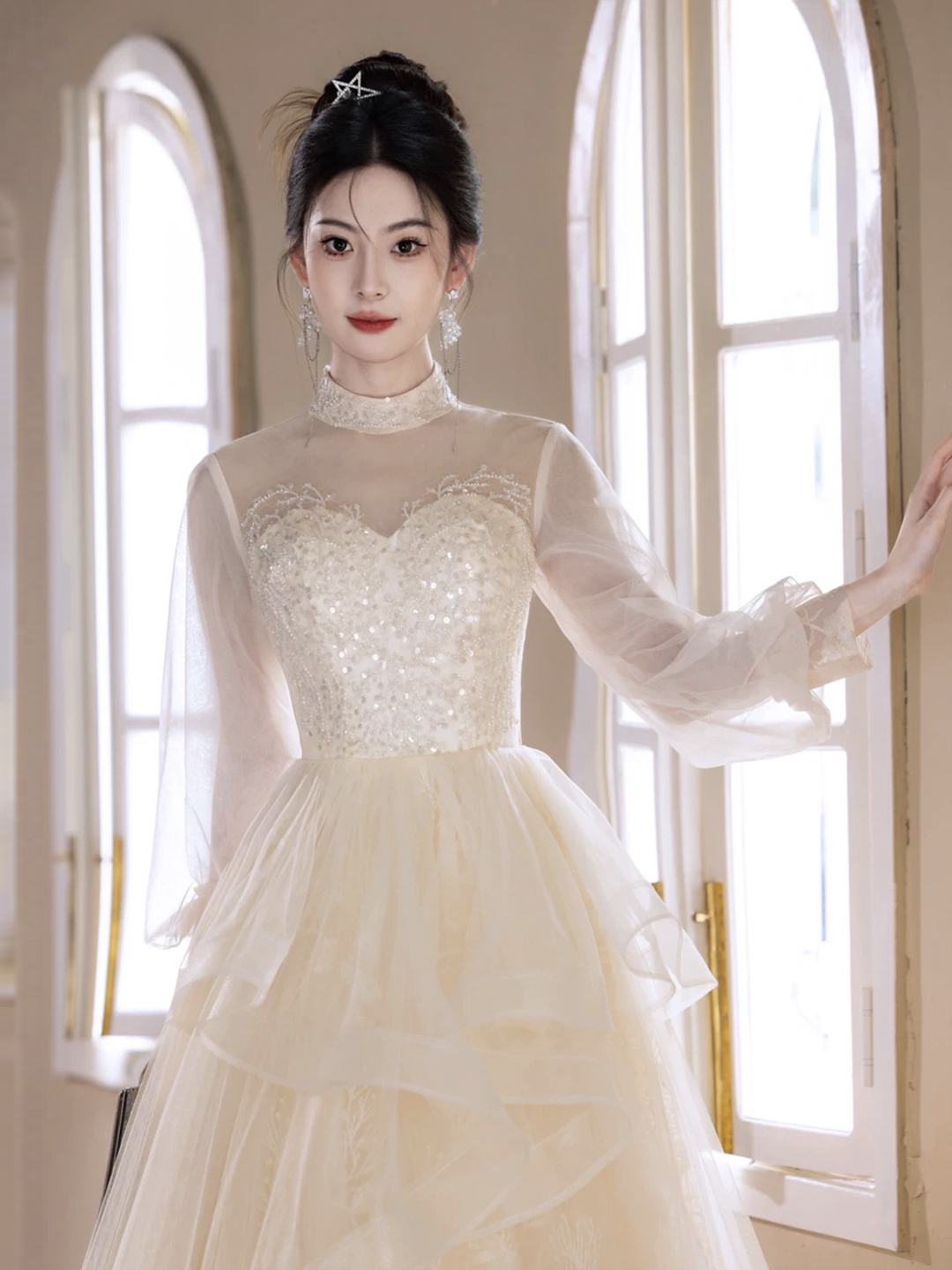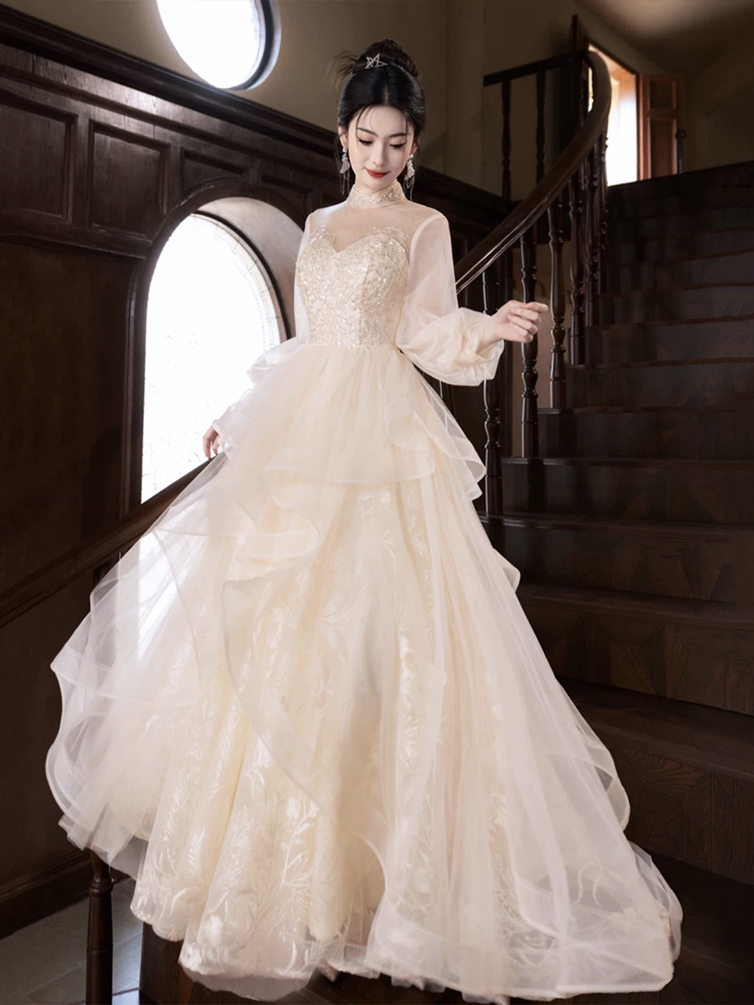 - Champagne Tulle Long Sleeve Evening Party Dress -