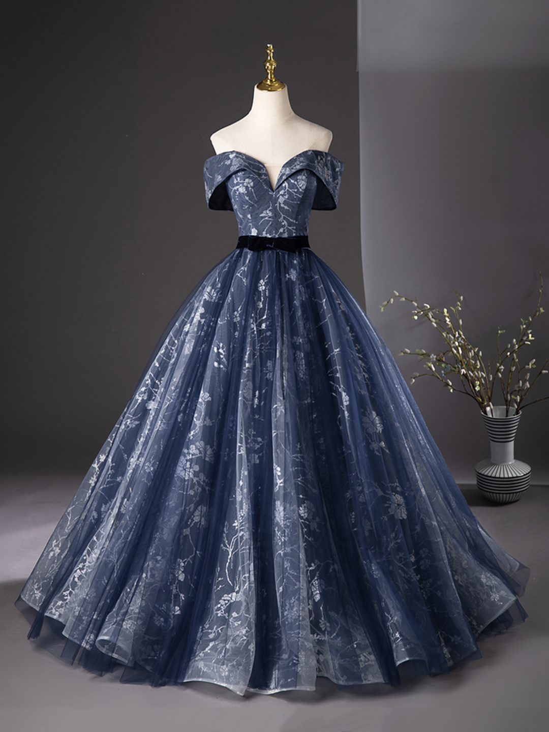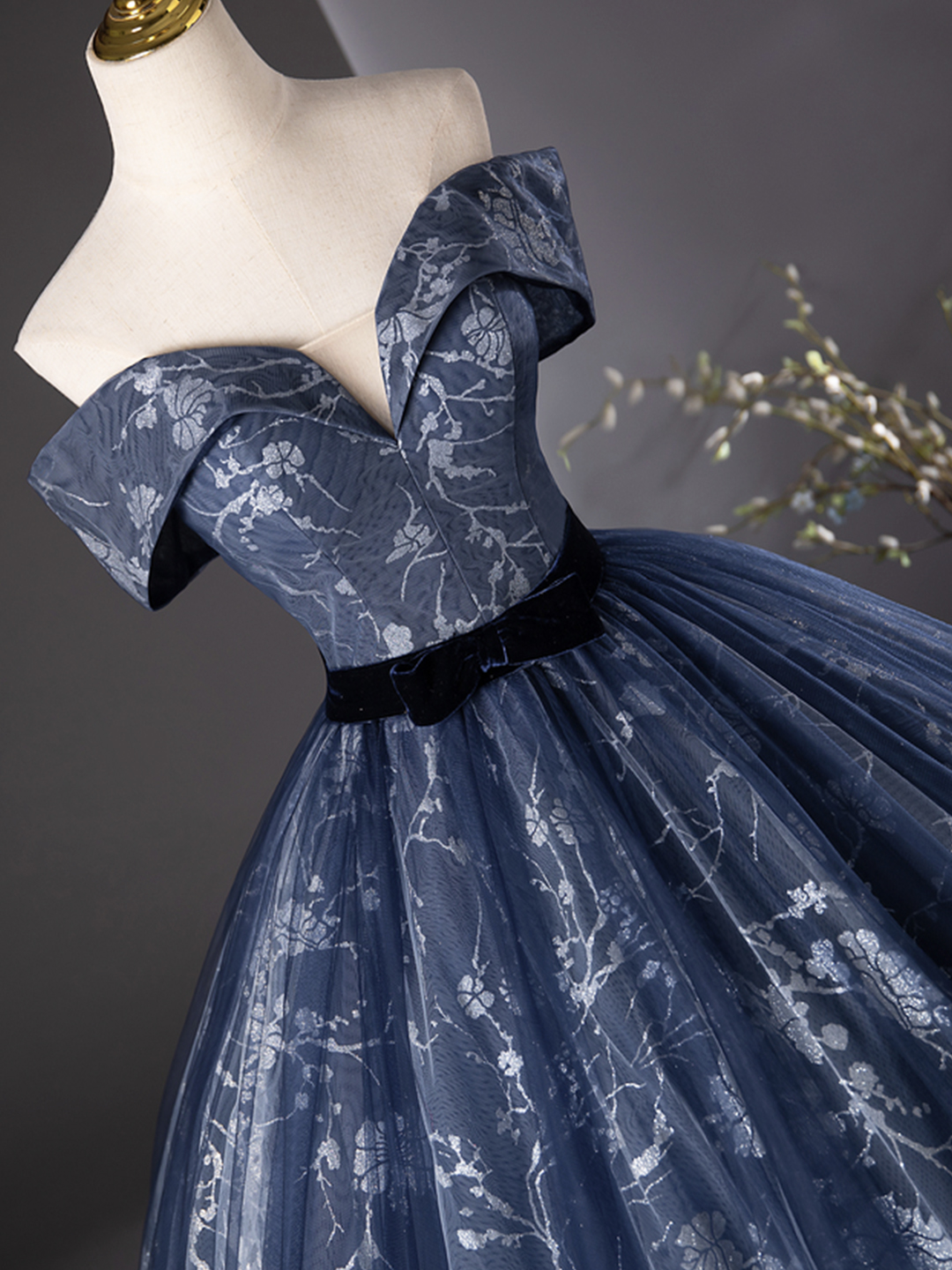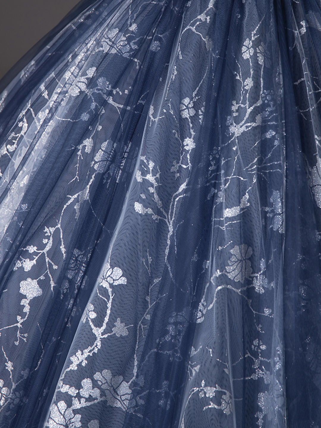 - Blue Floral Tulle Long A-Line Prom Party Dress -