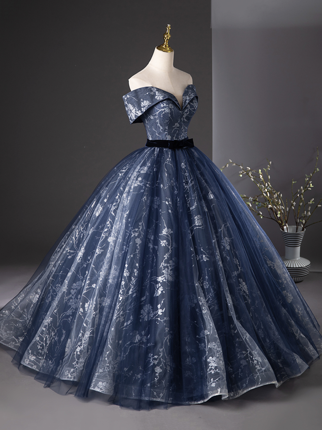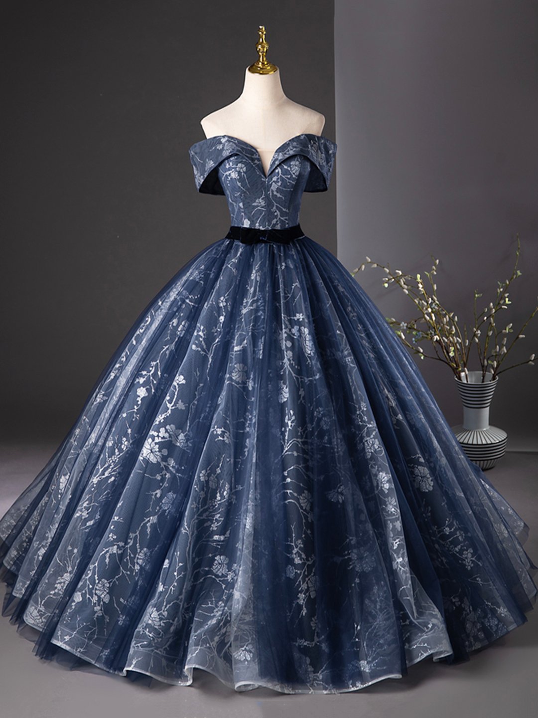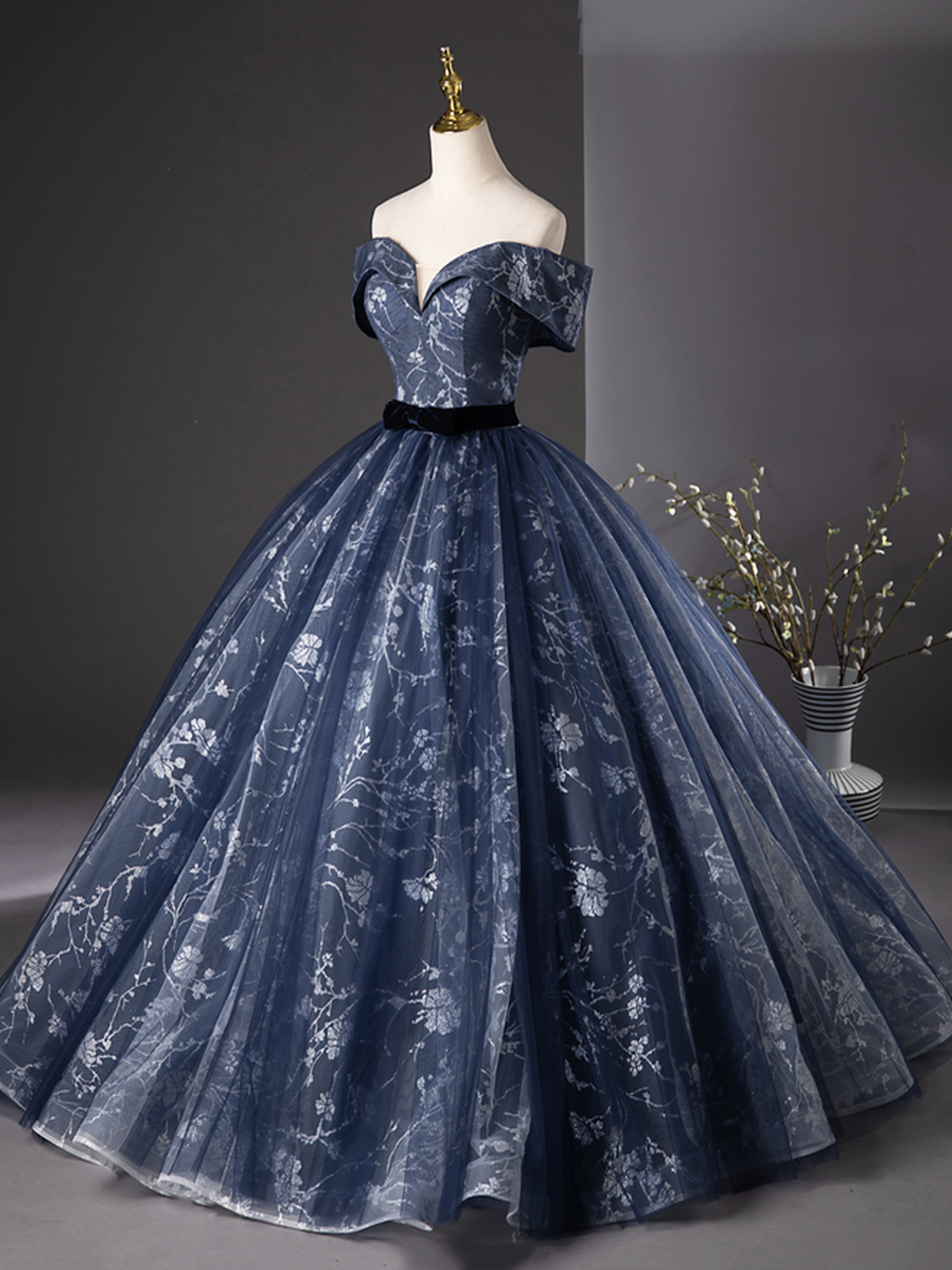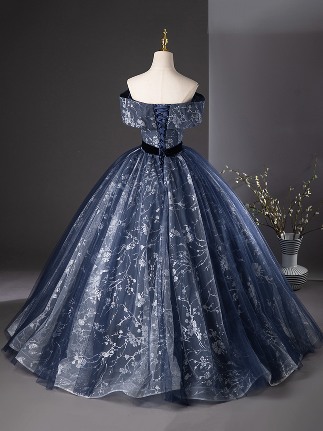 - Blue Floral Tulle Long A-Line Prom Party Dress -