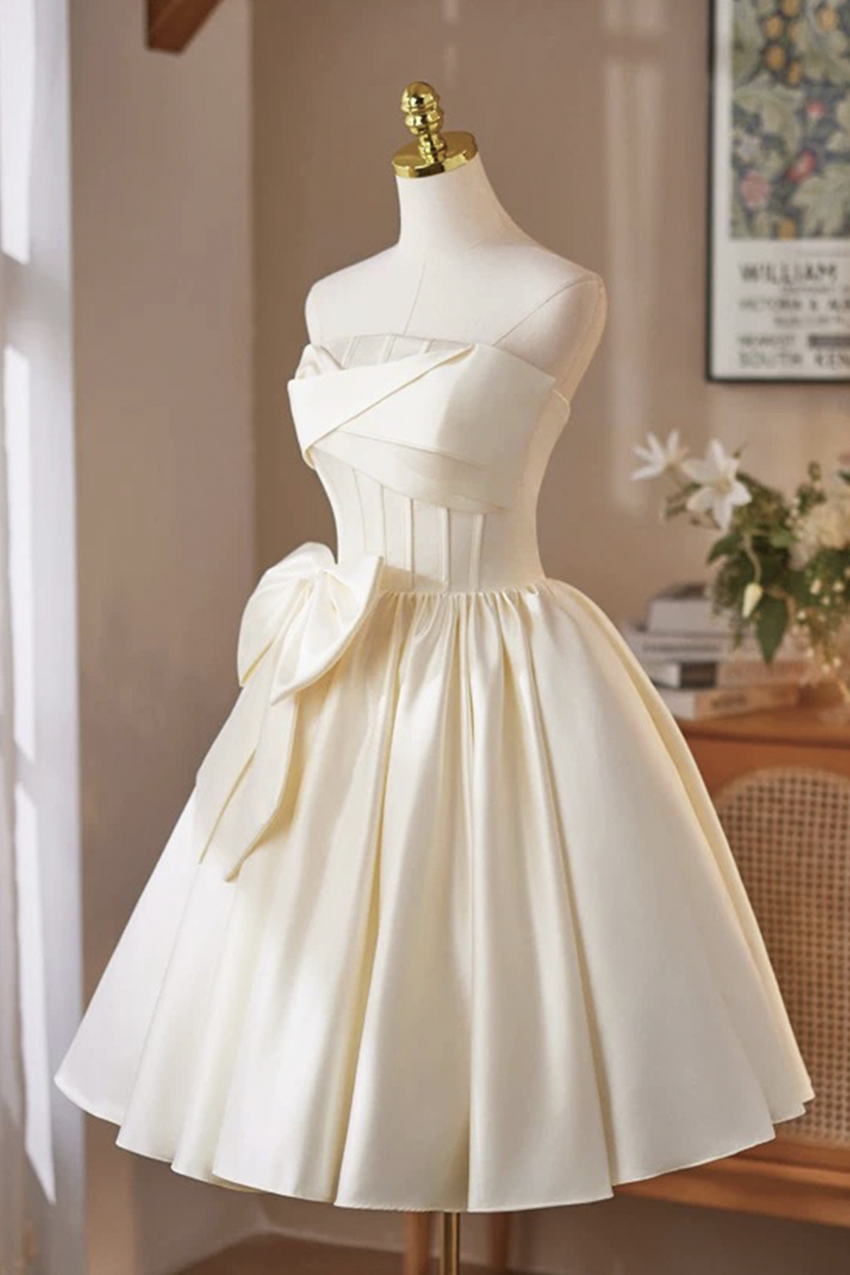 - Champagne Satin Short A-Line Strapless Prom Party Dress -