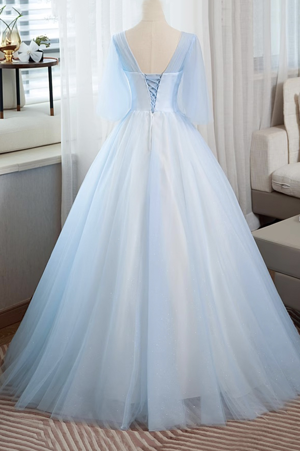 - Blue Tulle Lace Long Prom Dress, A-Line Beautiful Evening Party Dress -