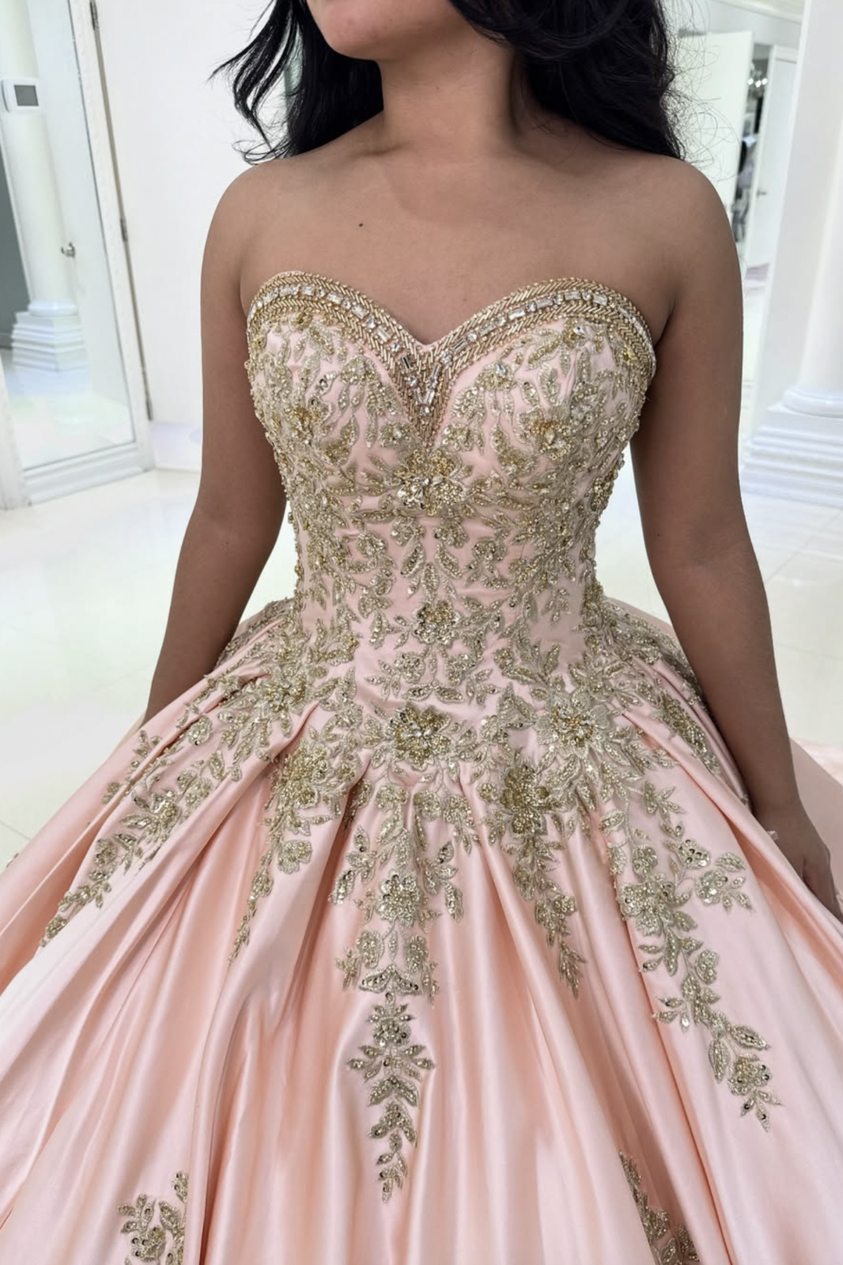 - Pink Satin Lace Long Prom Dress, Beautiful Strapless Formal Sweet 16 Dress -