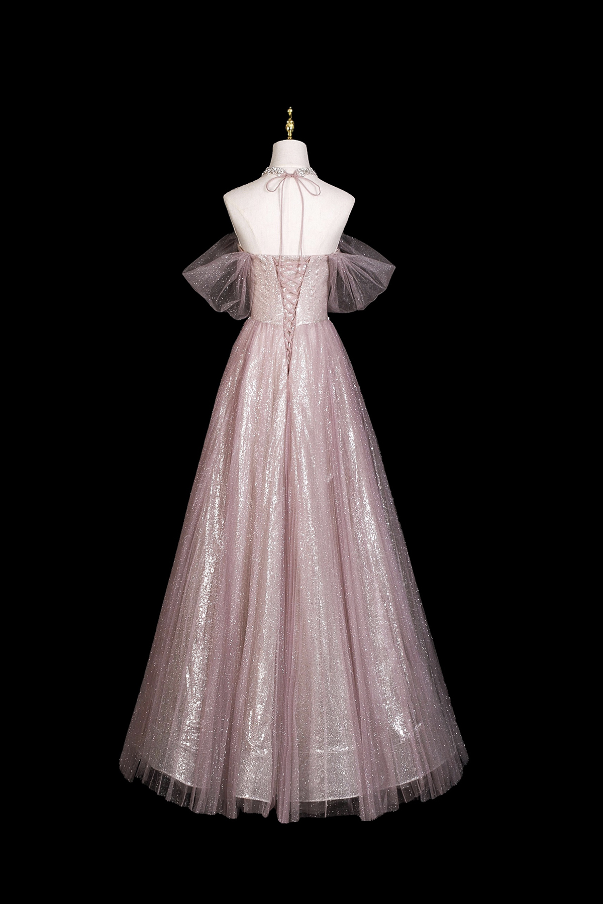- Pink Tulle Off the Shoulder Long A-Line Prom Party Dress with Rhinestones -
