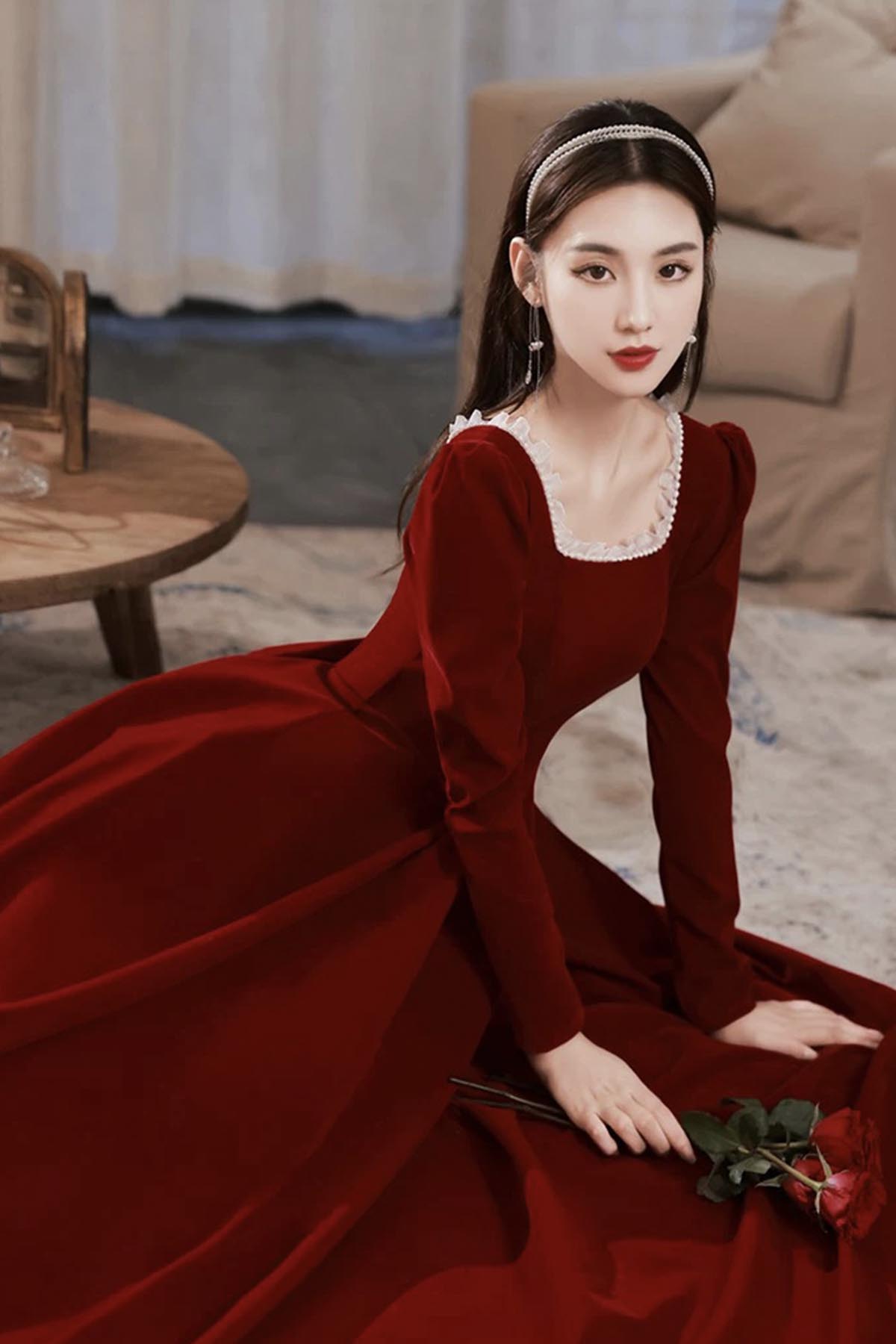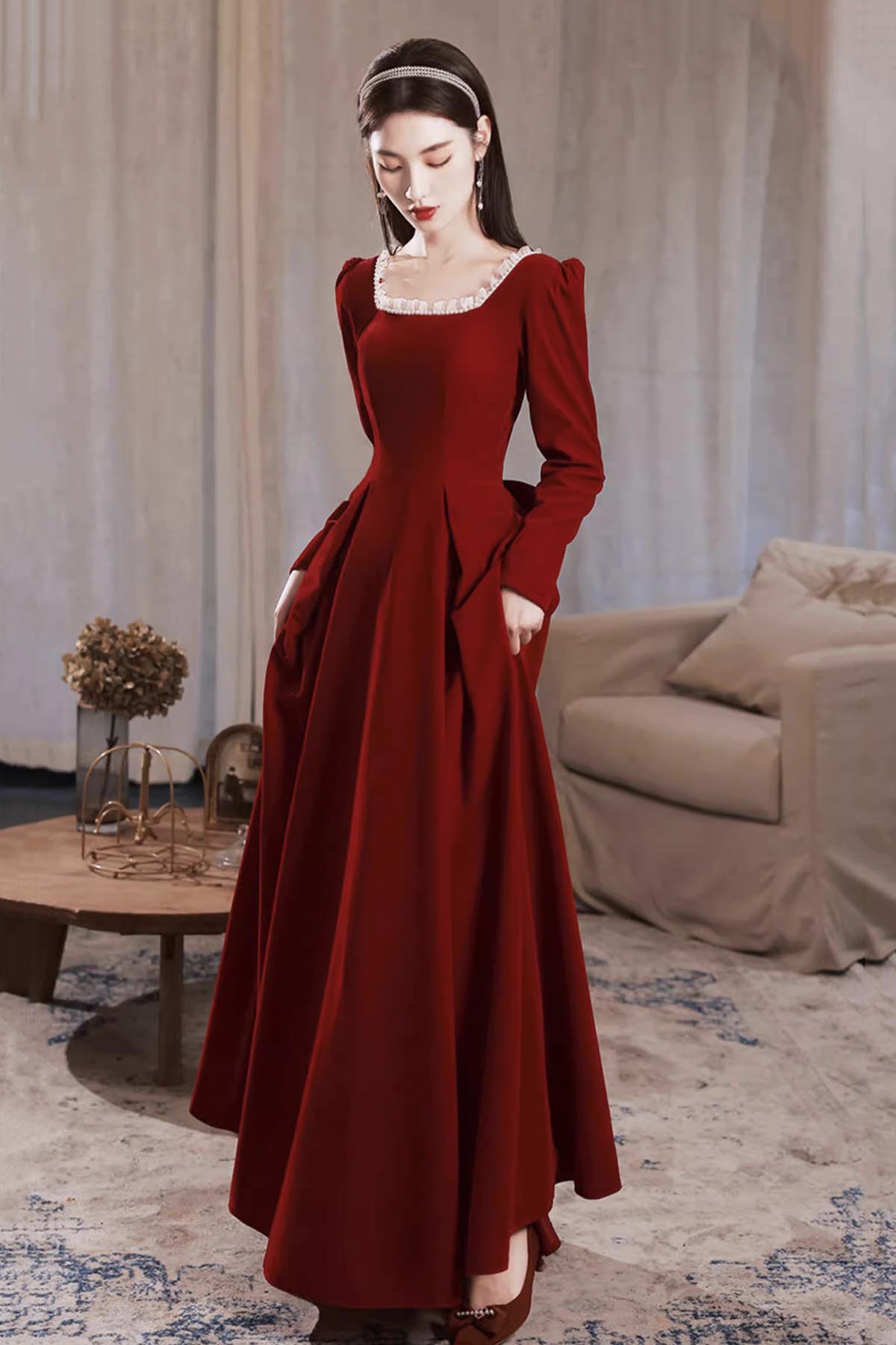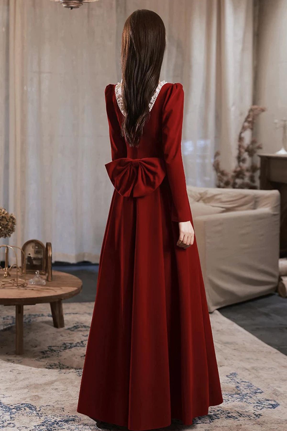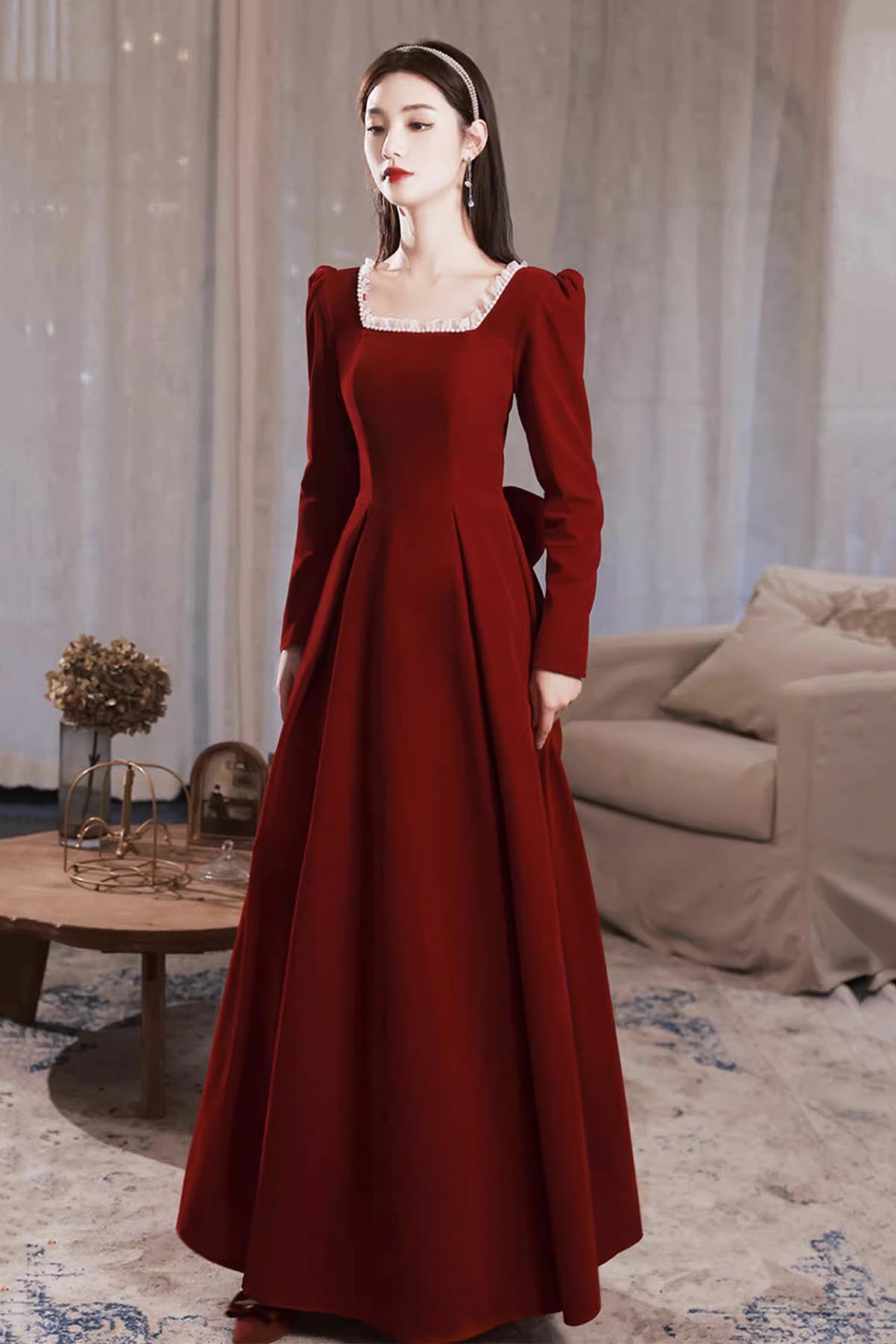 - Burgundy Velvet Long Sleeve Floor Length Prom Party Dress -
