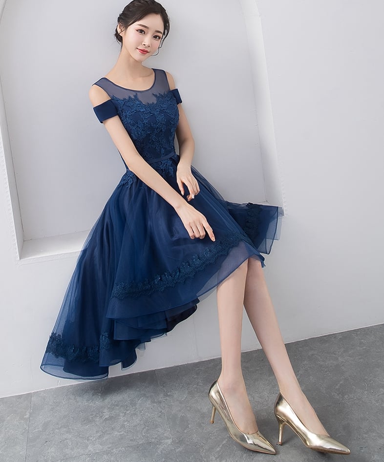 - Dark blue lace tulle short prom dress, high low evening dress -