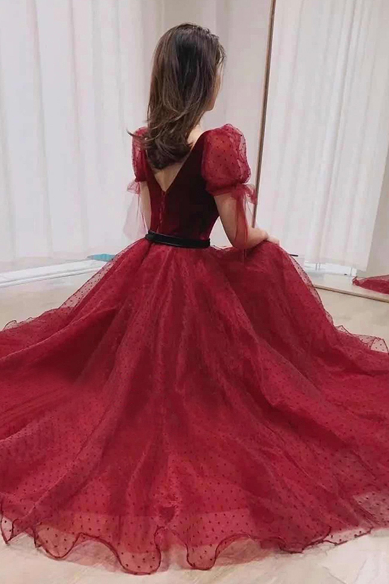 - Burgundy velvet tulle short prom dress homecoming dress -