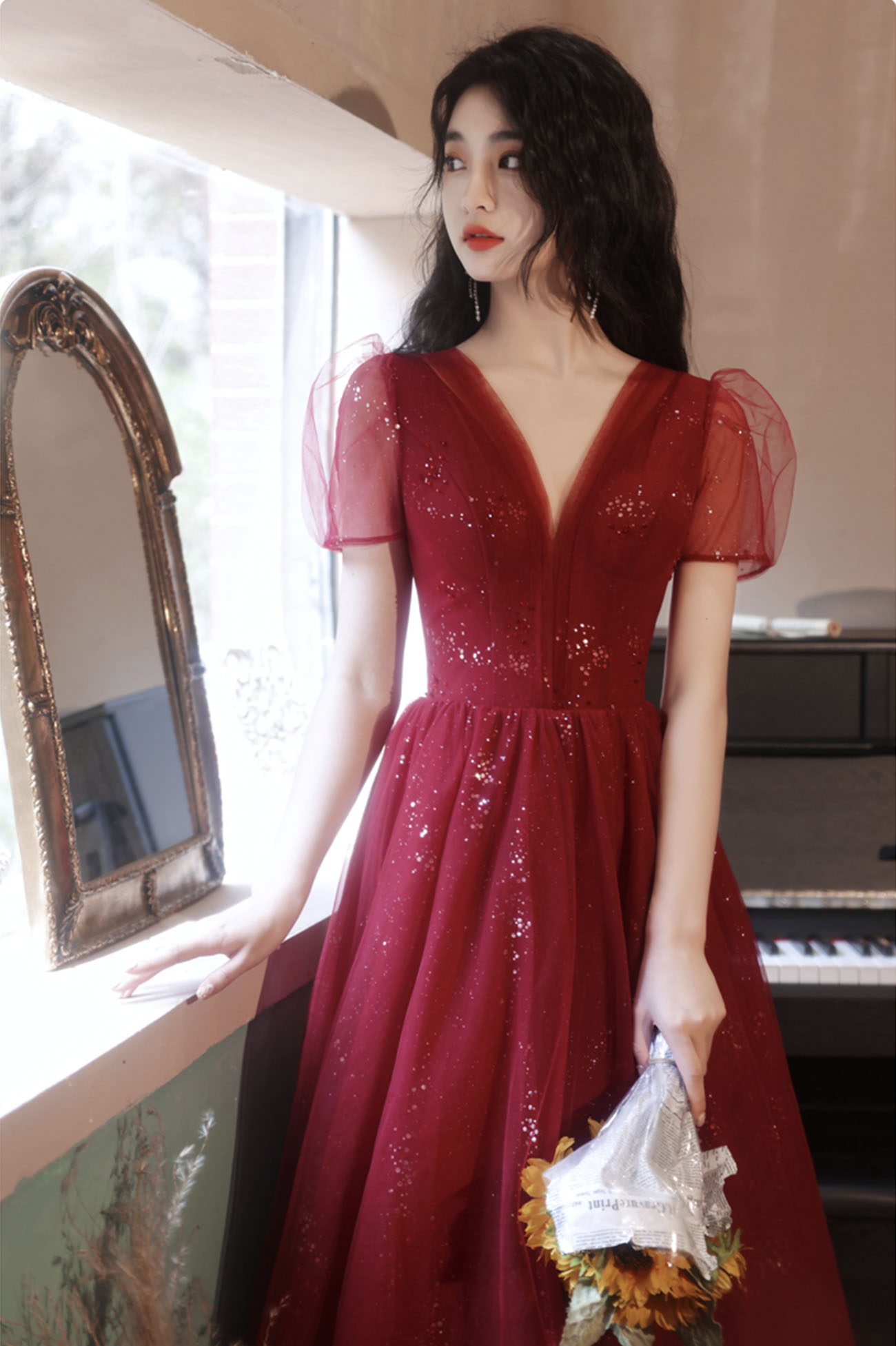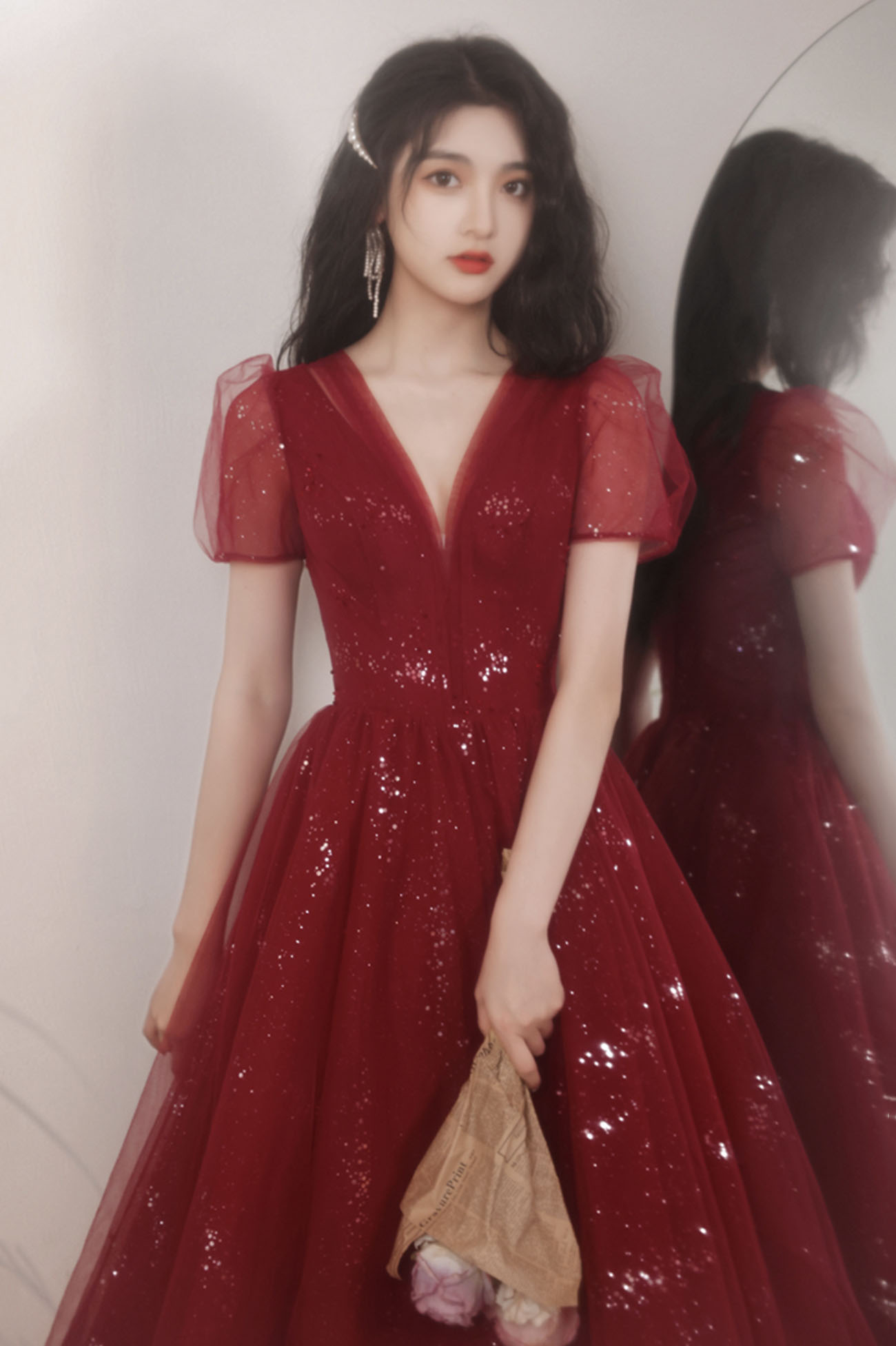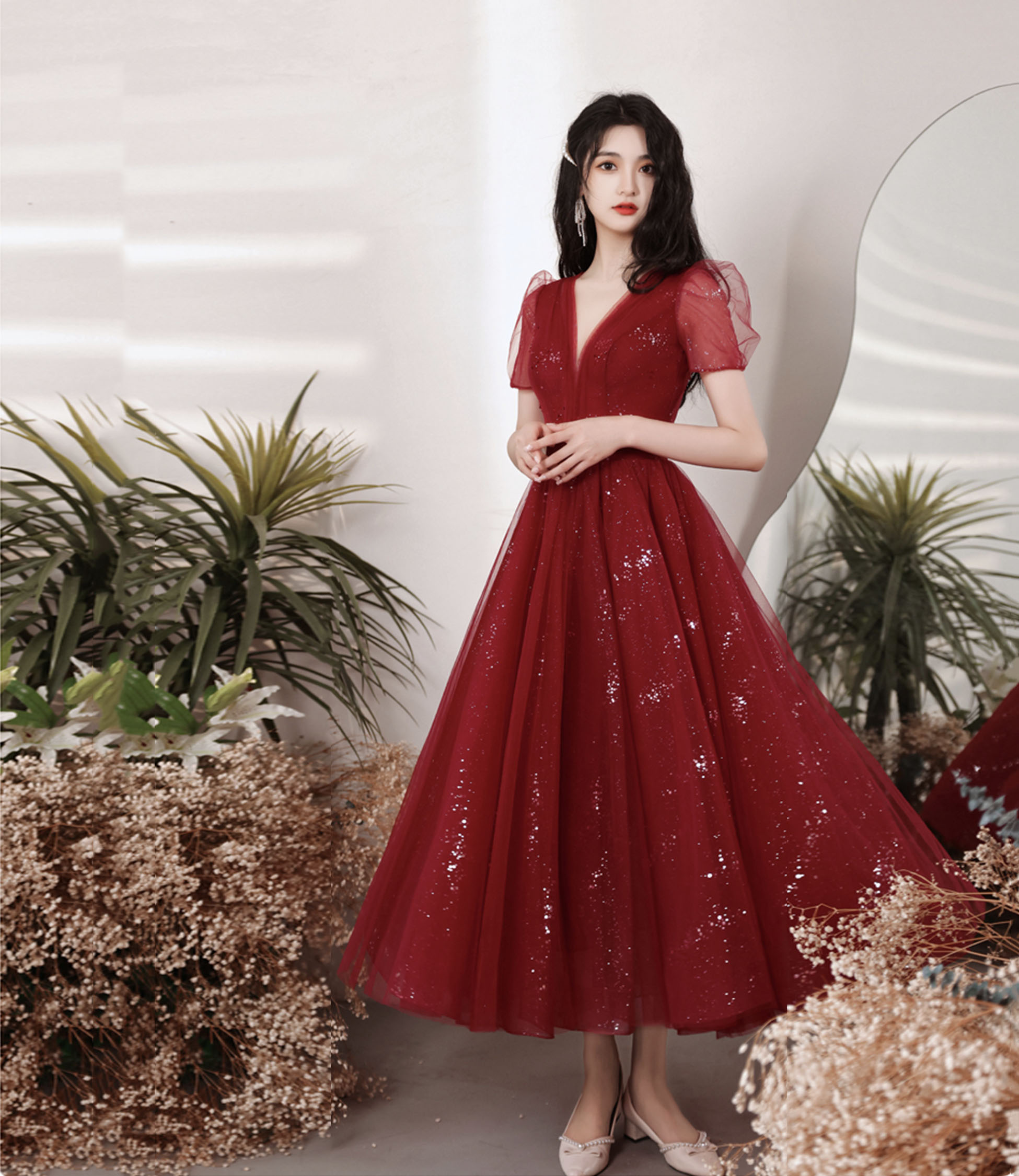- Burgundy V-neck tulle short prom dress homecoming dress -