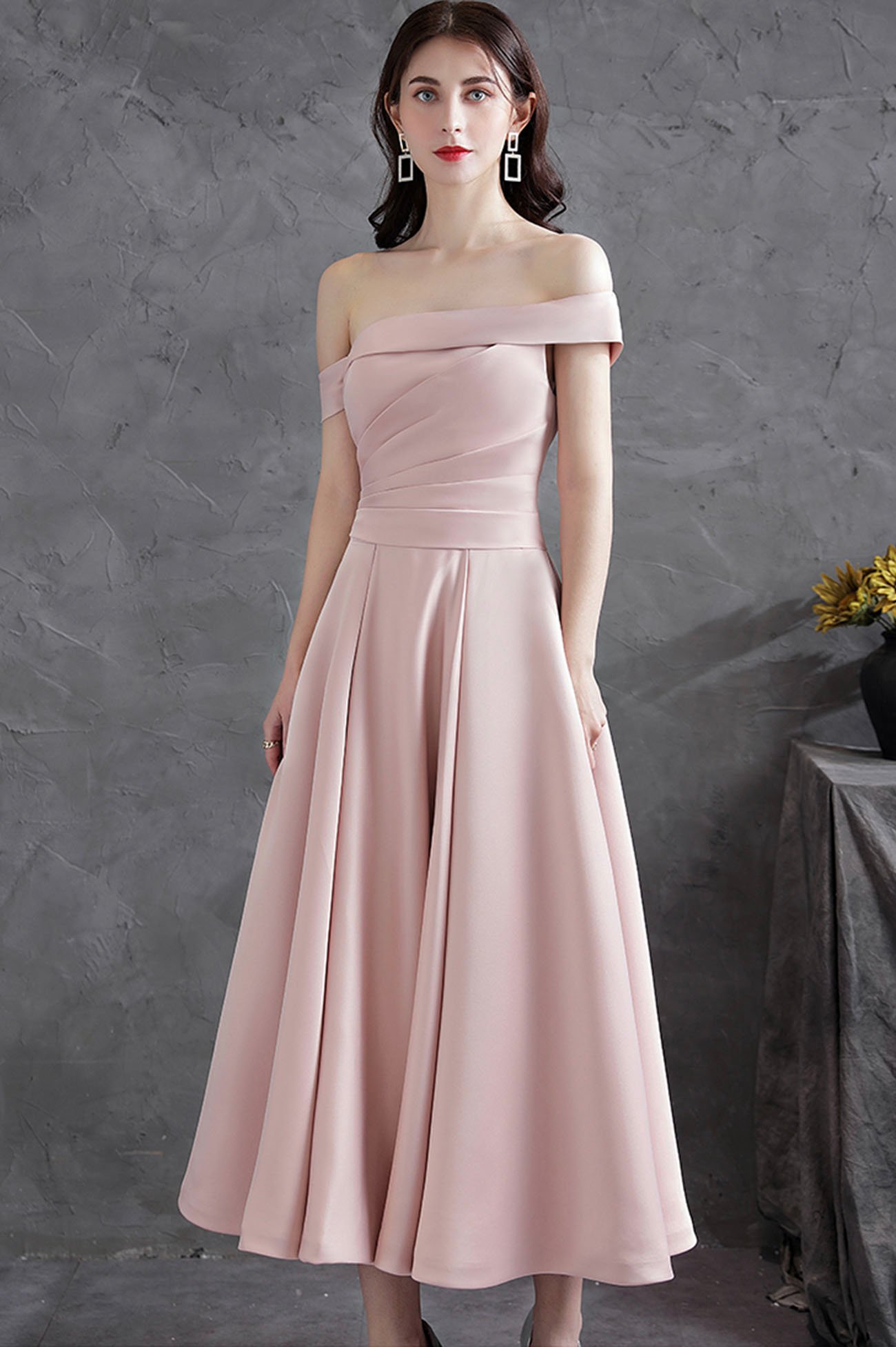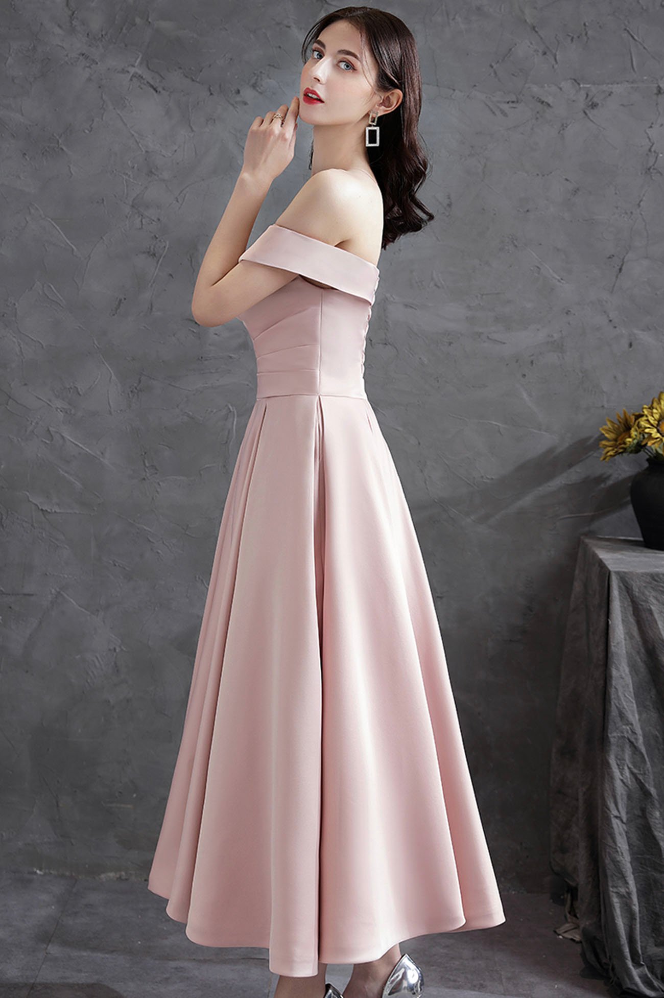 - Pink satin short prom dress off shoulder evening dress -