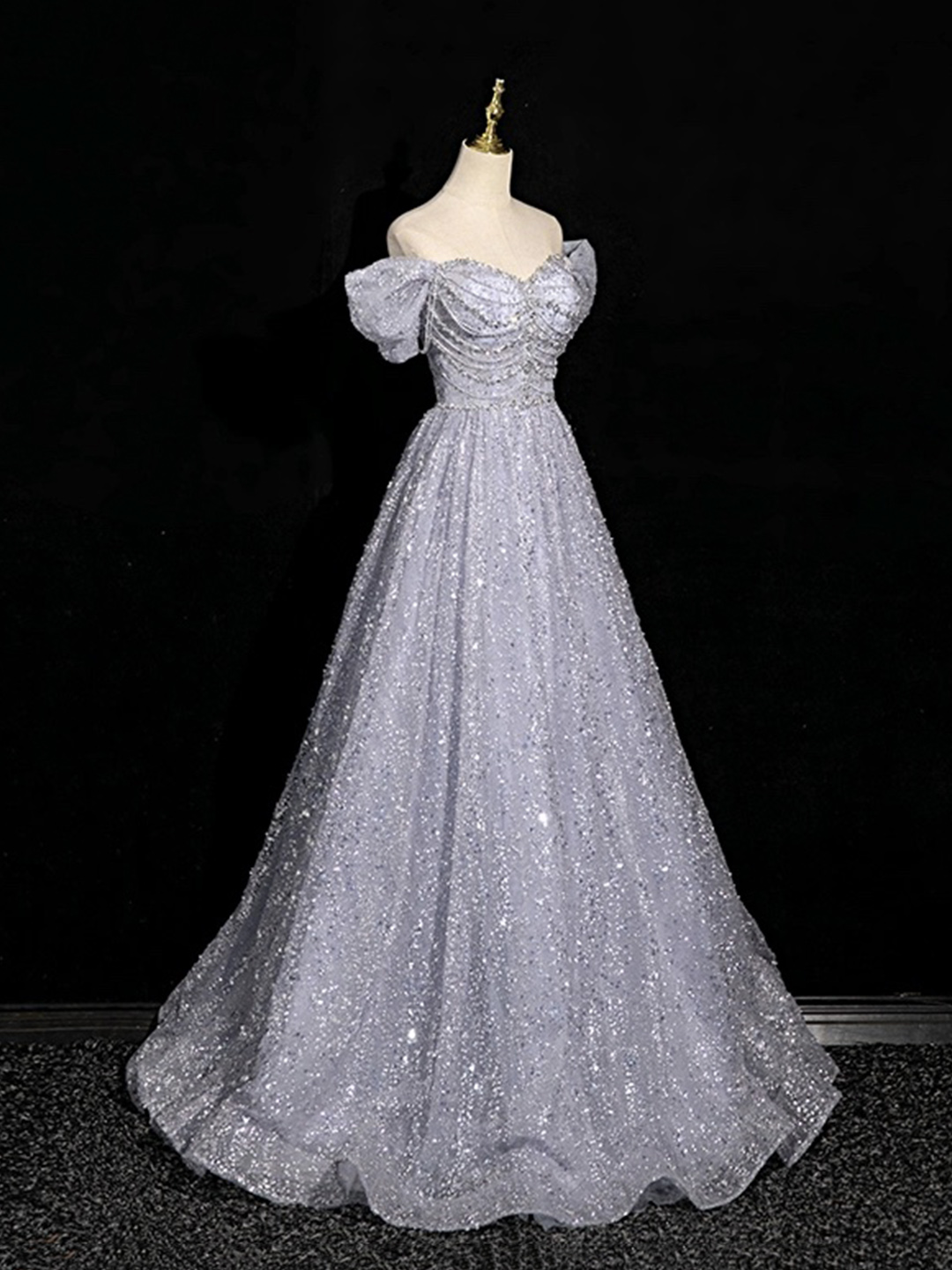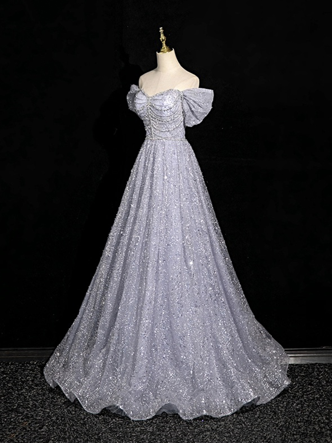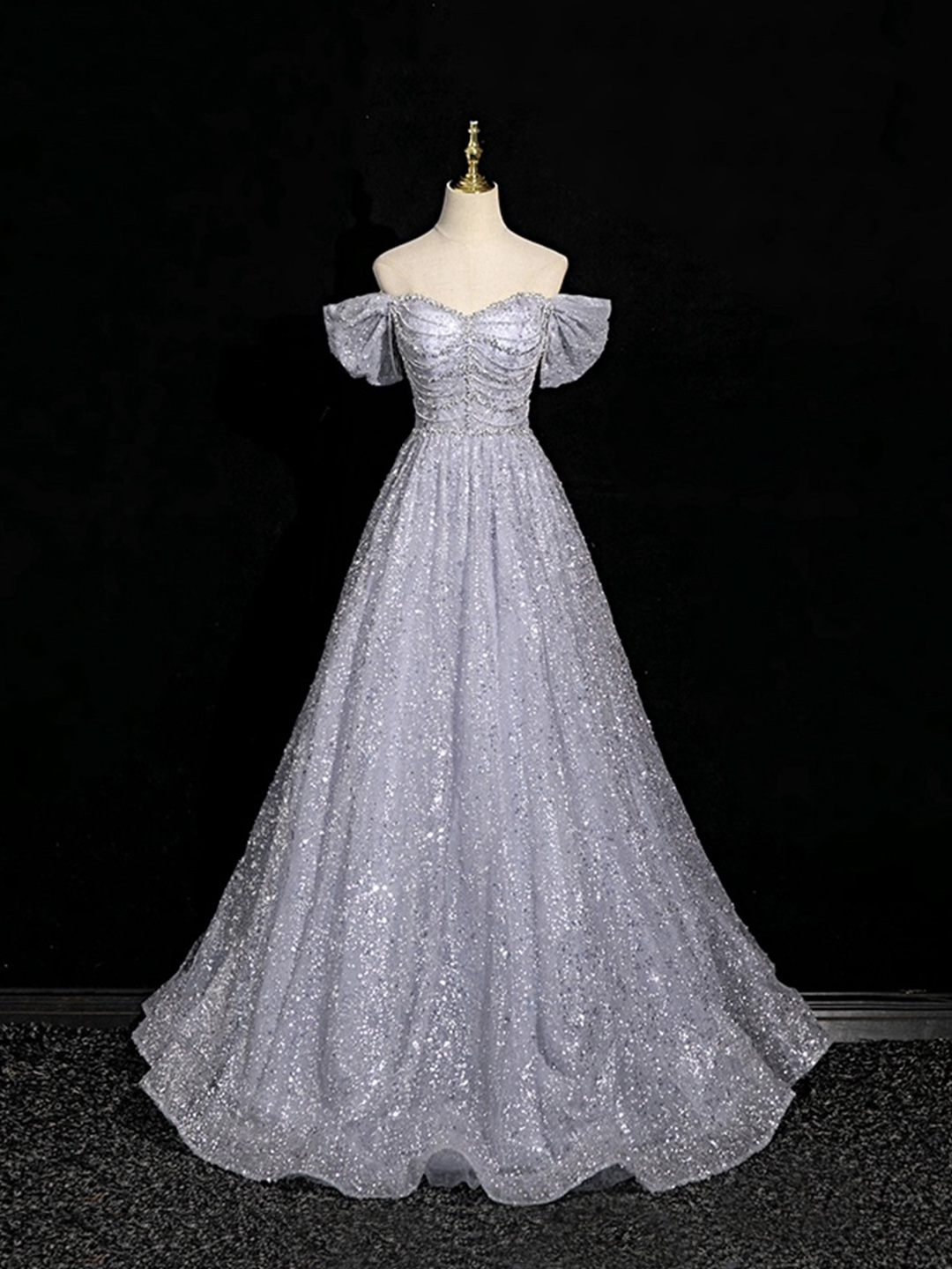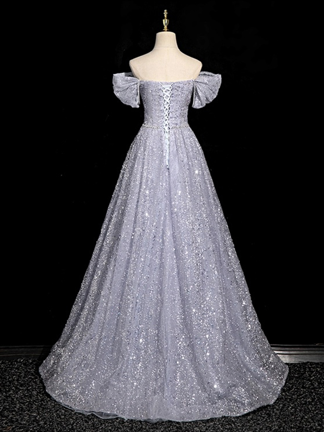 - Gray Tulle Sequins Floor Length Prom Dress -