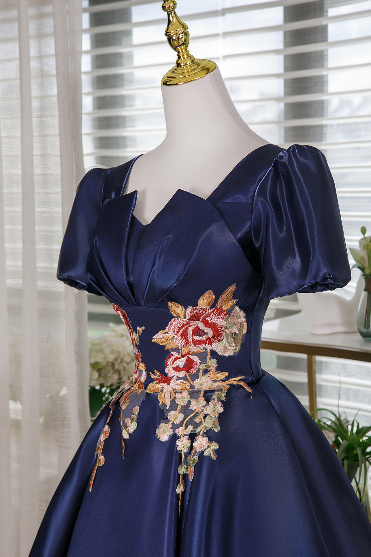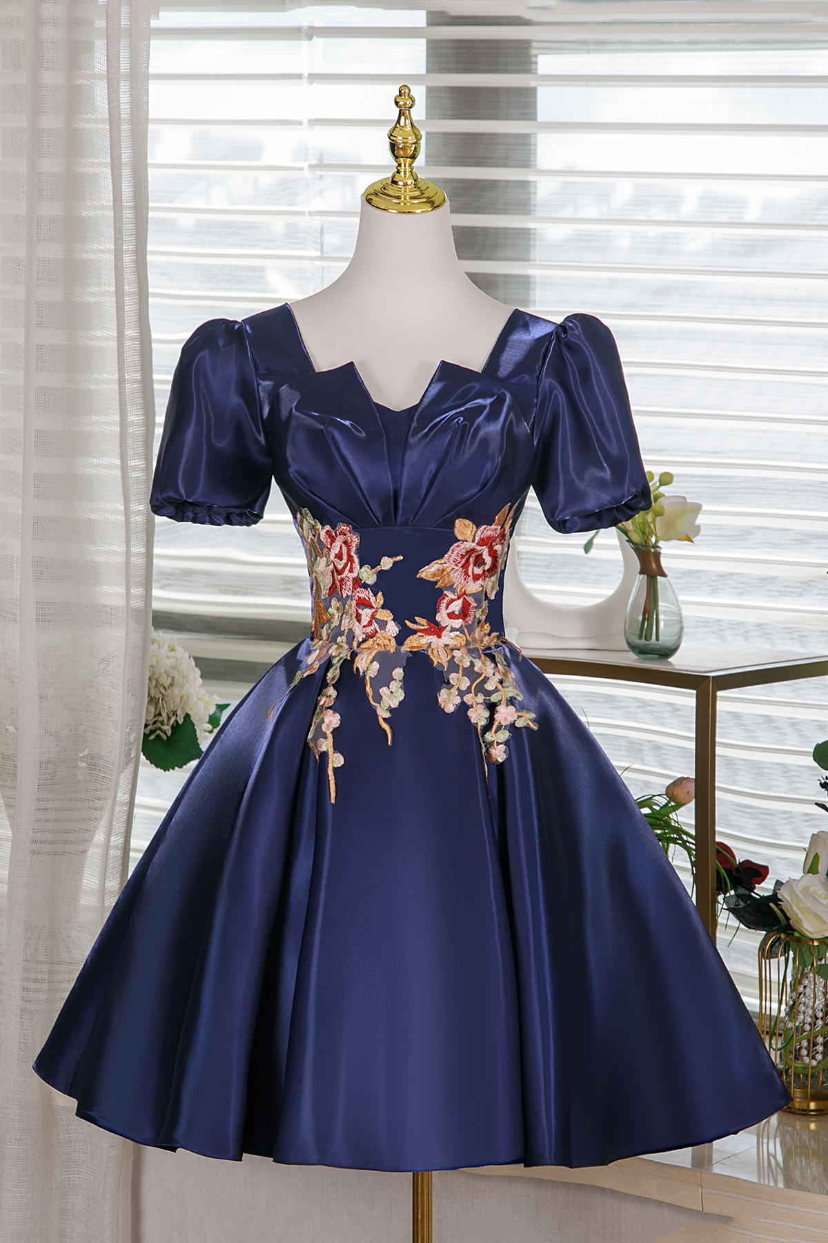 - Navy Satin Short Prom Dress, A-Line Short Sleeve Evening Party Dress -