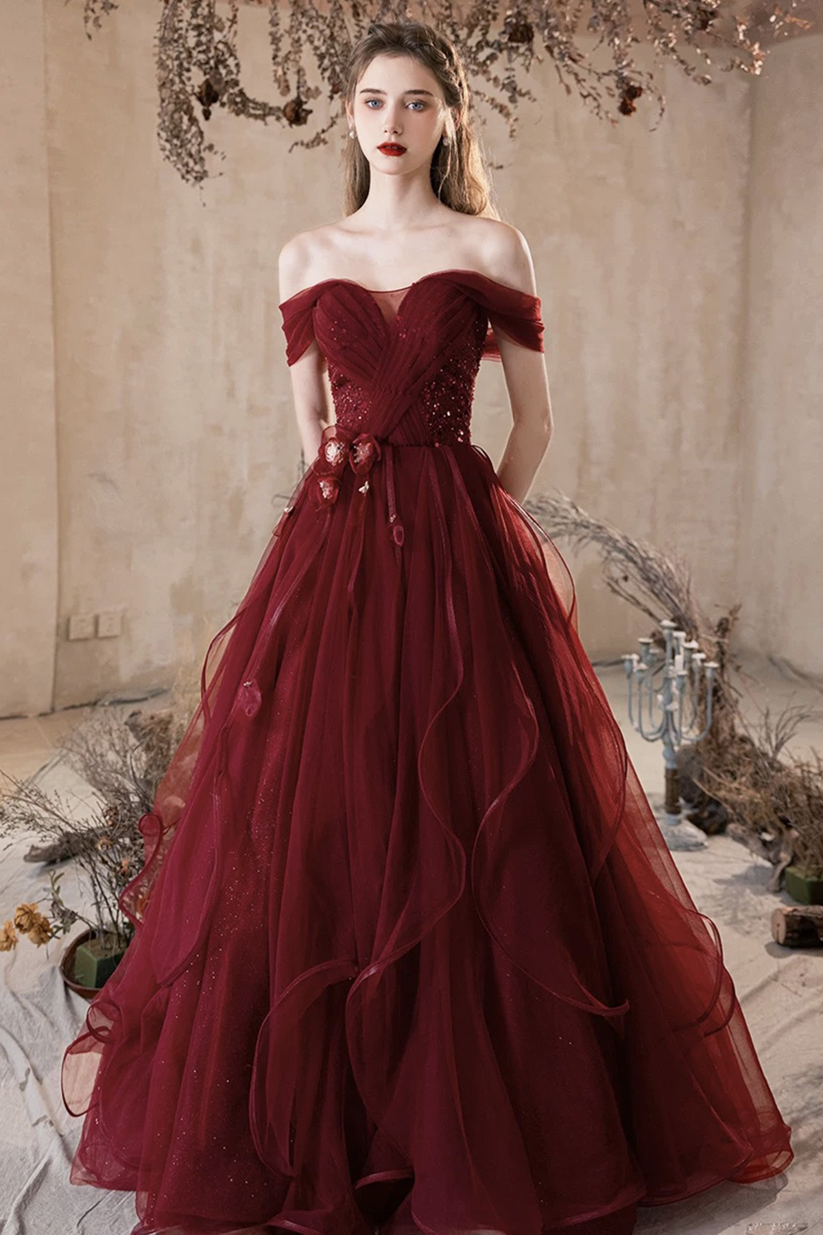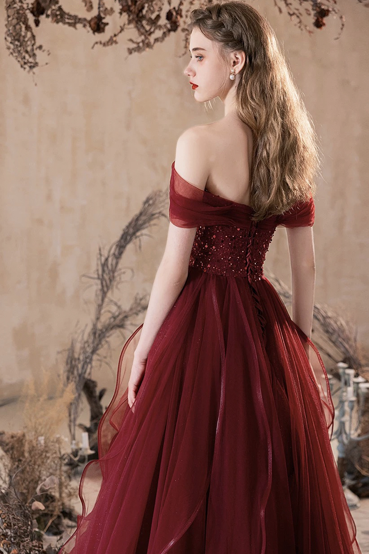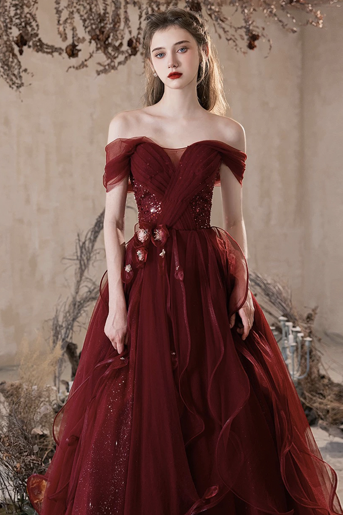 - Burgundy Tulle Sequins Long Prom Party Dress -