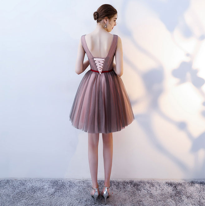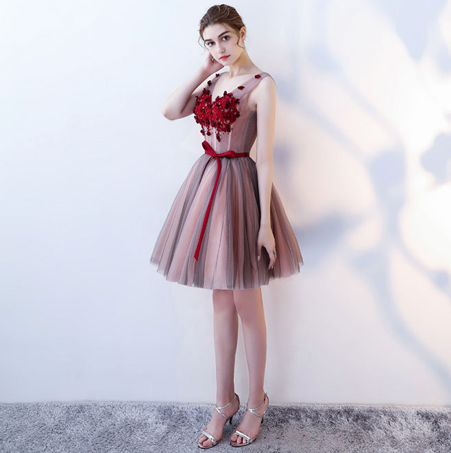 - Cute v neck tulle lace short prom dress, homecoming dress -