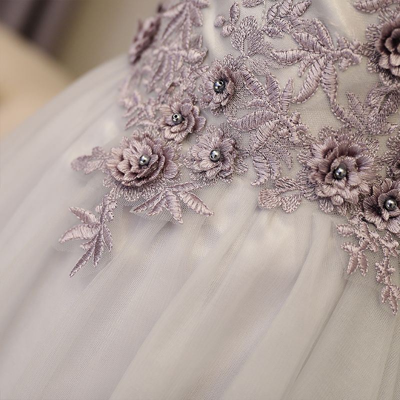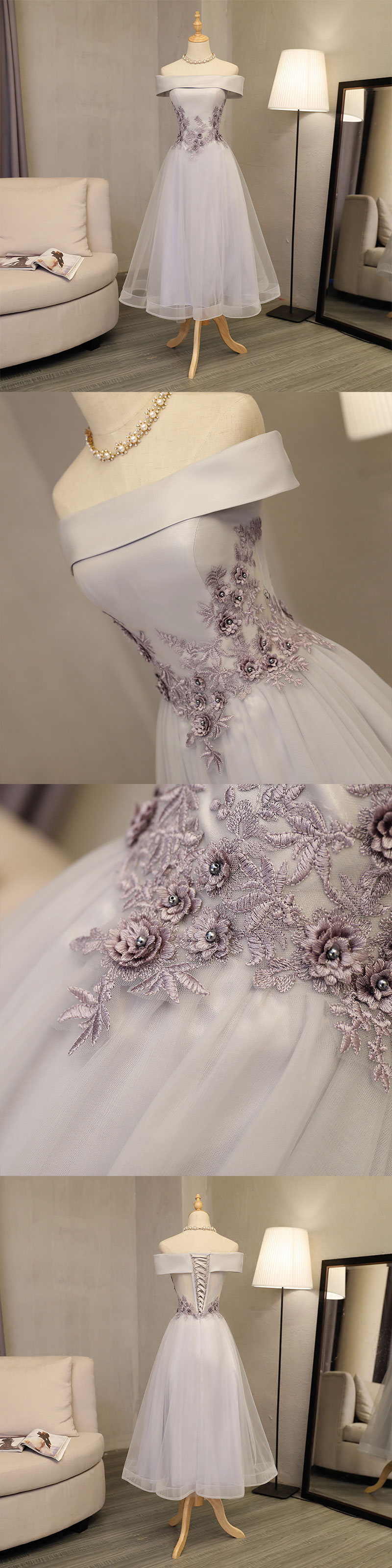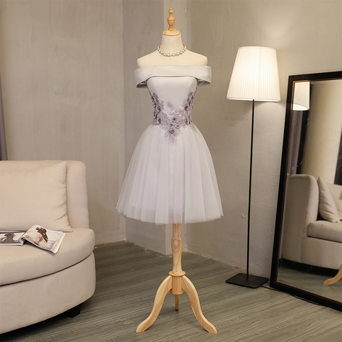 - Elegant A line gray off shoulder prom dress, short evening dresses -
