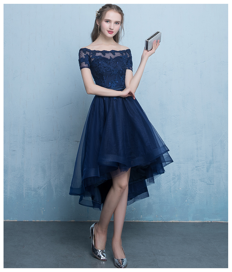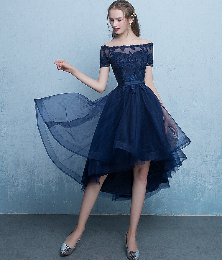 - Dark blue lace tulle short prom dress, high low evening dress -