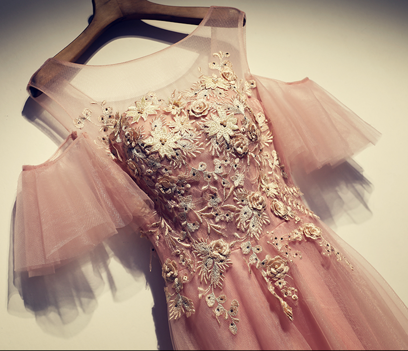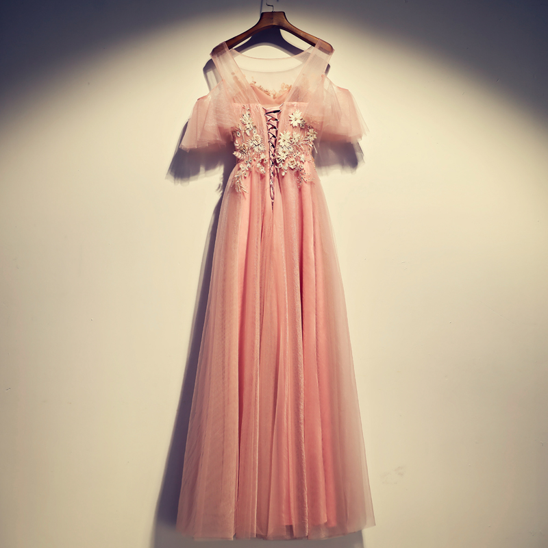 - Pink round neck tulle lace long prom dress, pink evening dress -