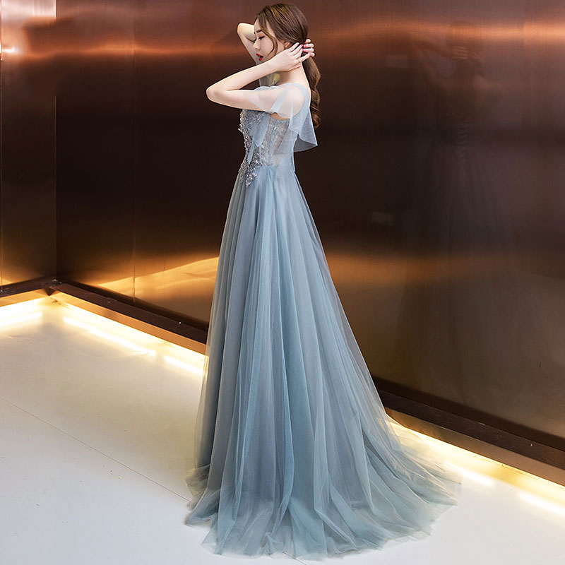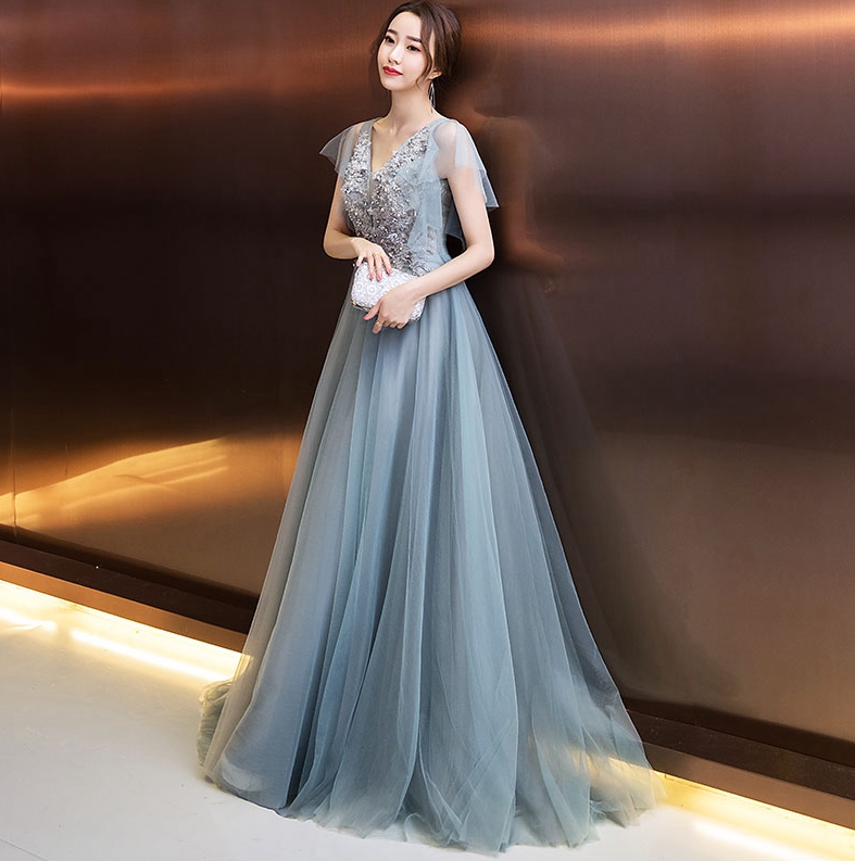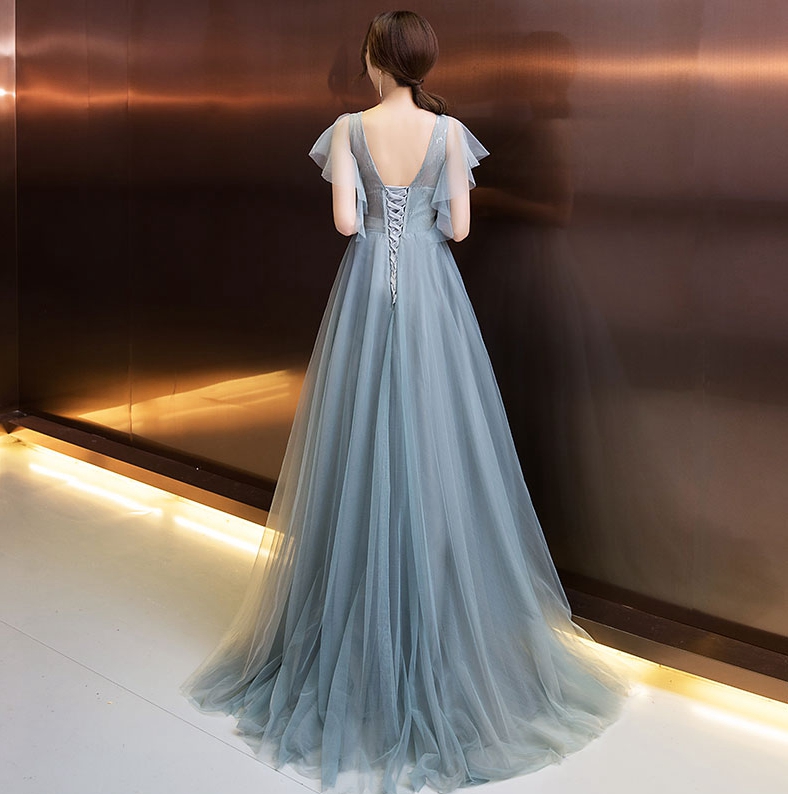 - Gray v neck tulle lace long prom dress, lace evening dress -