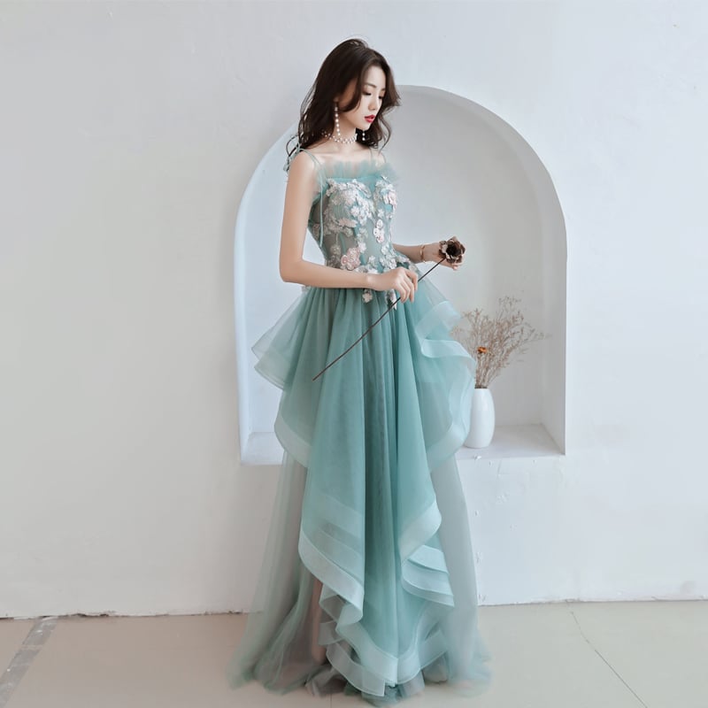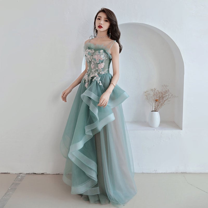 - Unique tulle lace long prom dress, green evening dress -