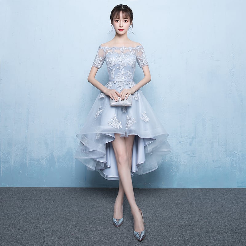 Gray tulle lace short prom dress, high low evening dress