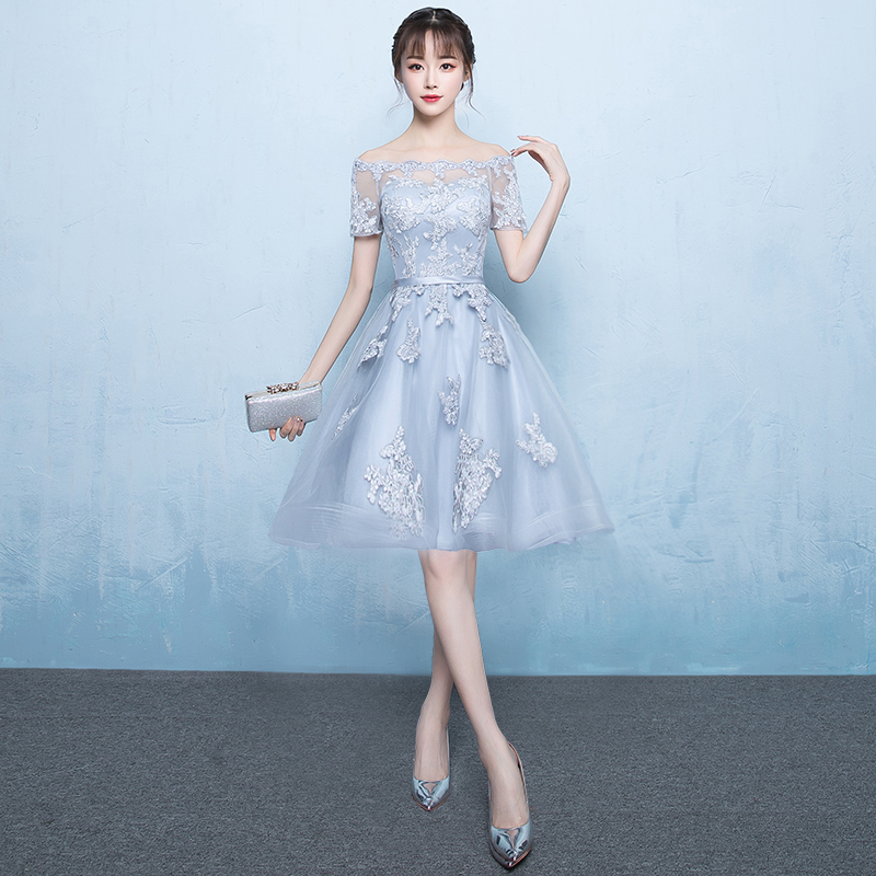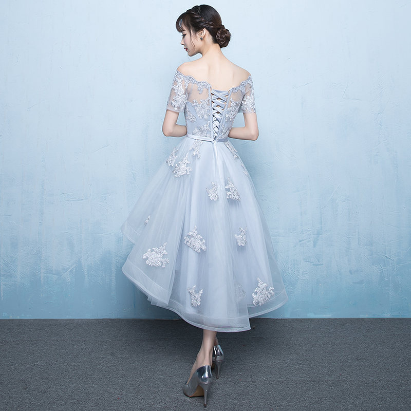 - Gray tulle lace short prom dress, high low evening dress -