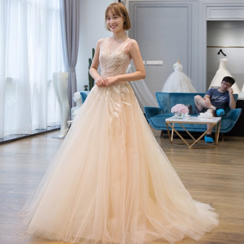 - Champagne tulle lace long prom dress, evening dress -
