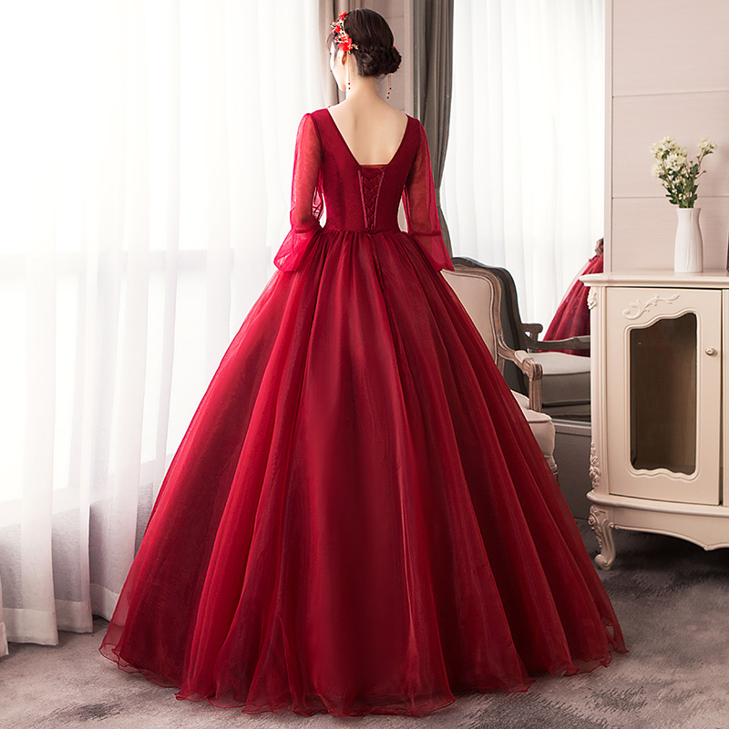 - Burgundy v neck tulle lace long prom dress, evening dress -