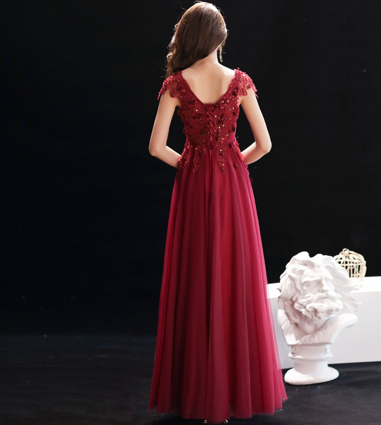 - Burgundy v neck lace sequins long prom dress, evening dress -