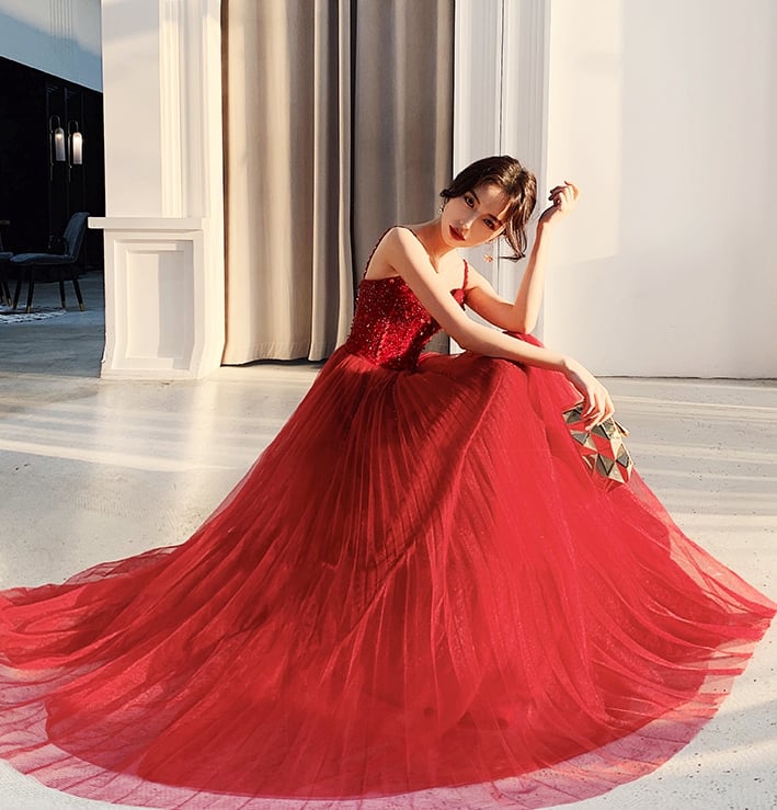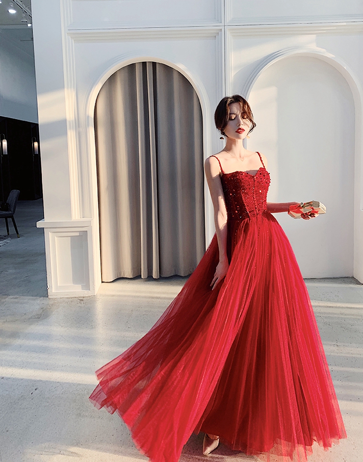 - Cute sweetheart neck tulle beads long prom dress, formal dress -