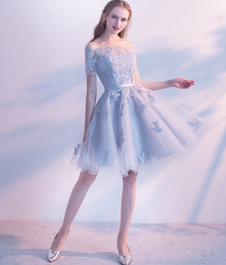 - Gray lace tulle short prom dress, homecoming dress -