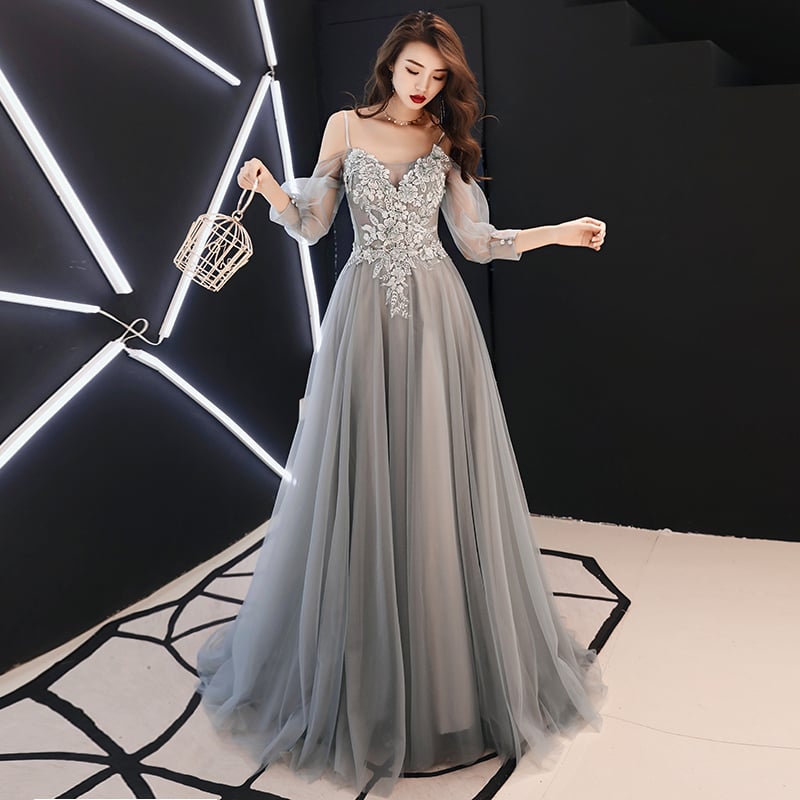 - Gray lace tulle long prom dress, long sleeve evening dress -