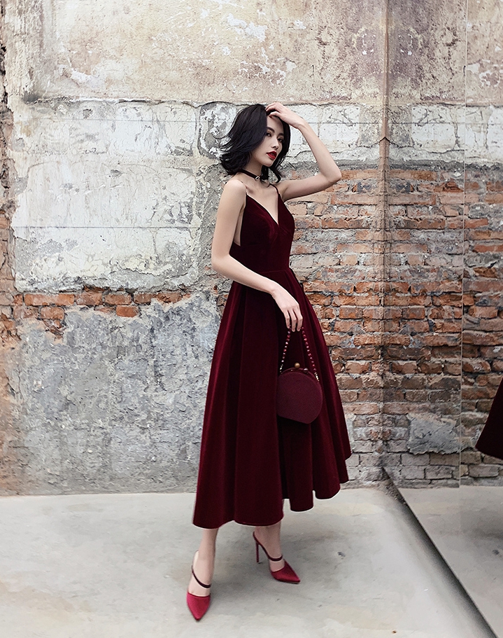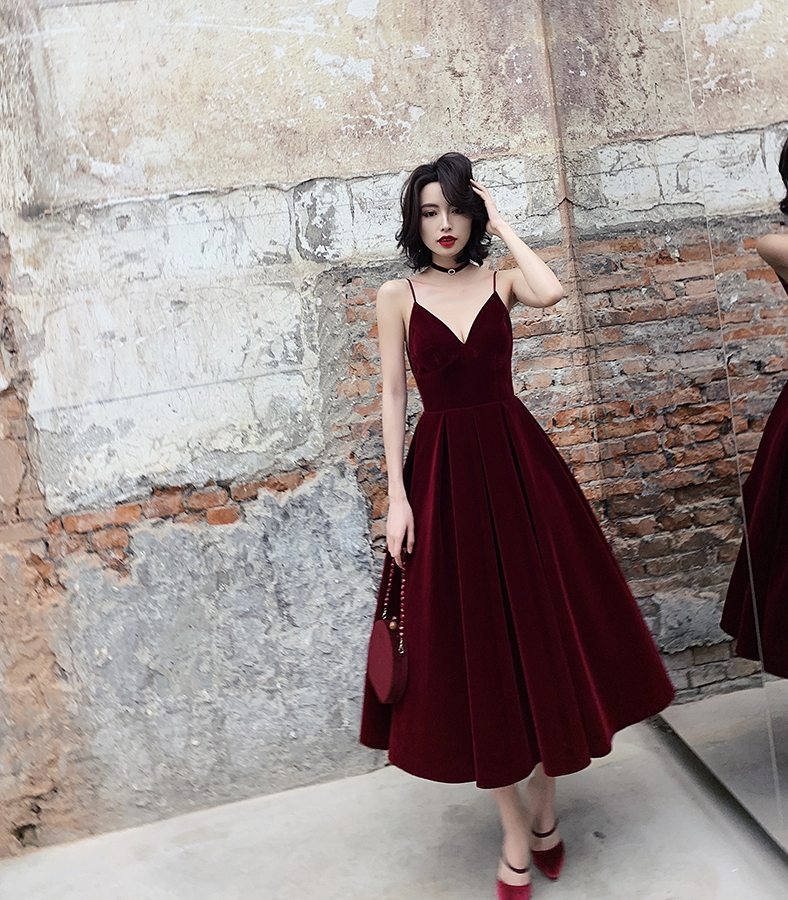 - Cute v neck velvet short prom dress, burgundy homecoming dress -