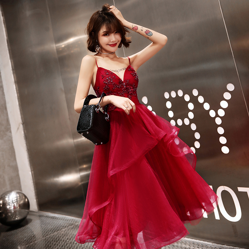 - Burgundy tulle lace short prom dress, homecoming dress -