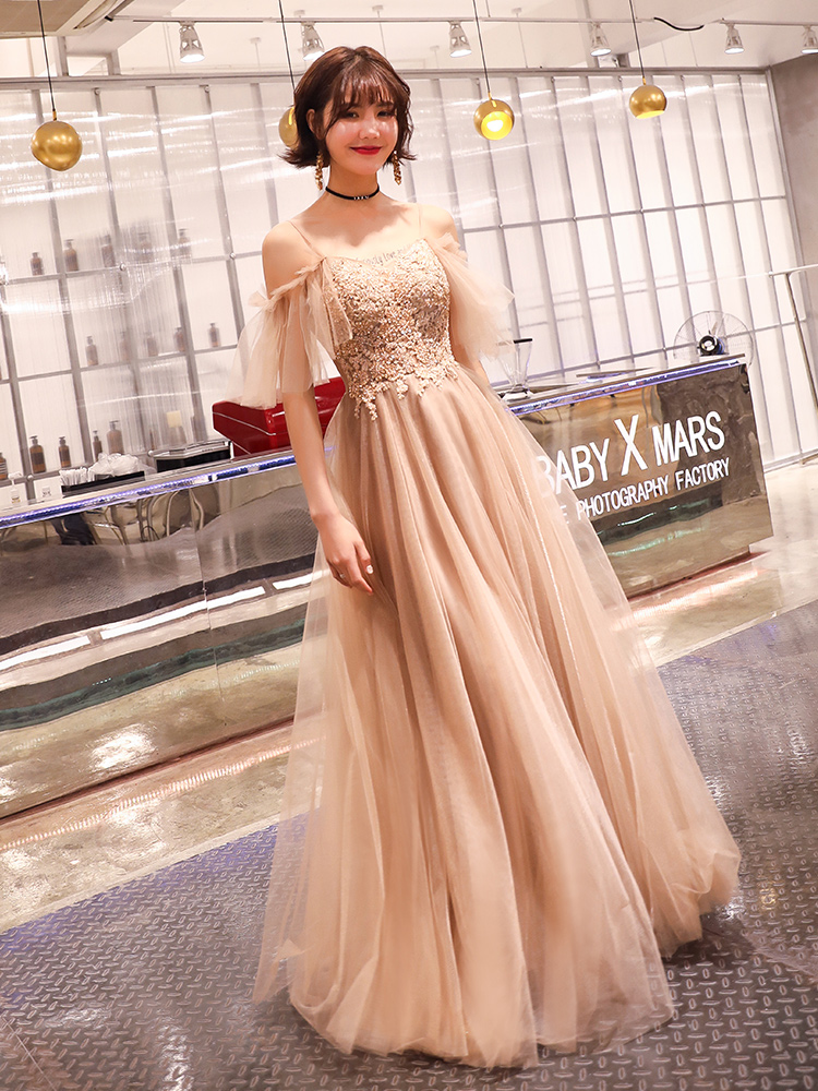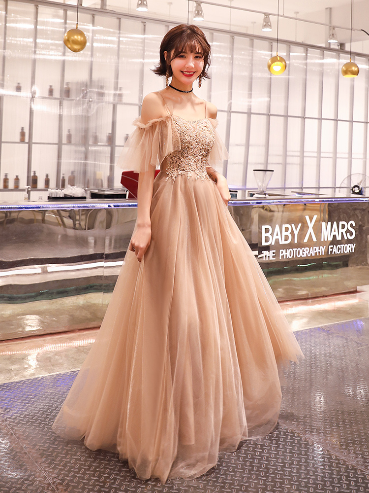 - Coffee tulle lace long prom dress evening dress -