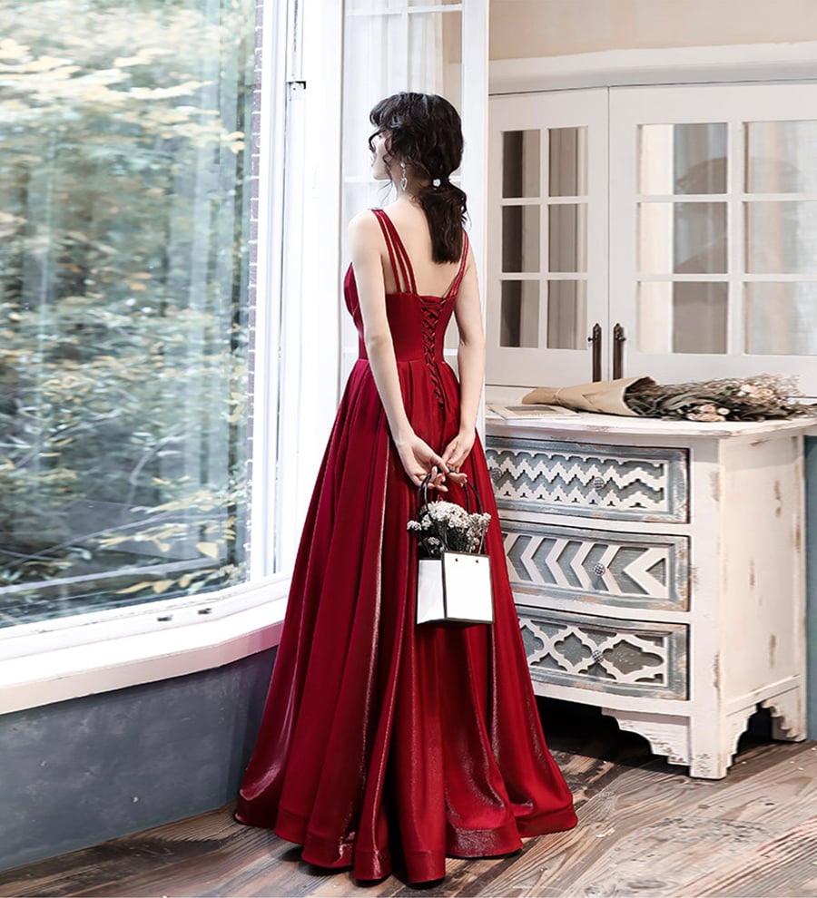 - Burgundy satin long prom dress formal dress -