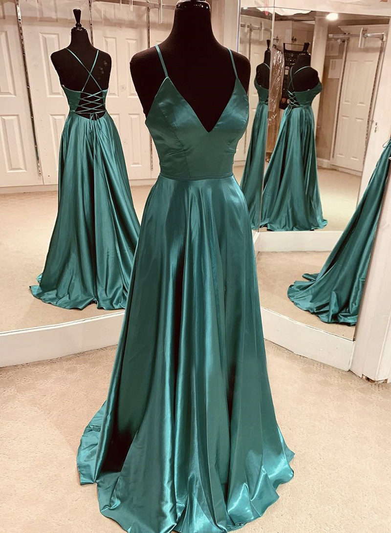 Green satin long prom dress evening dress