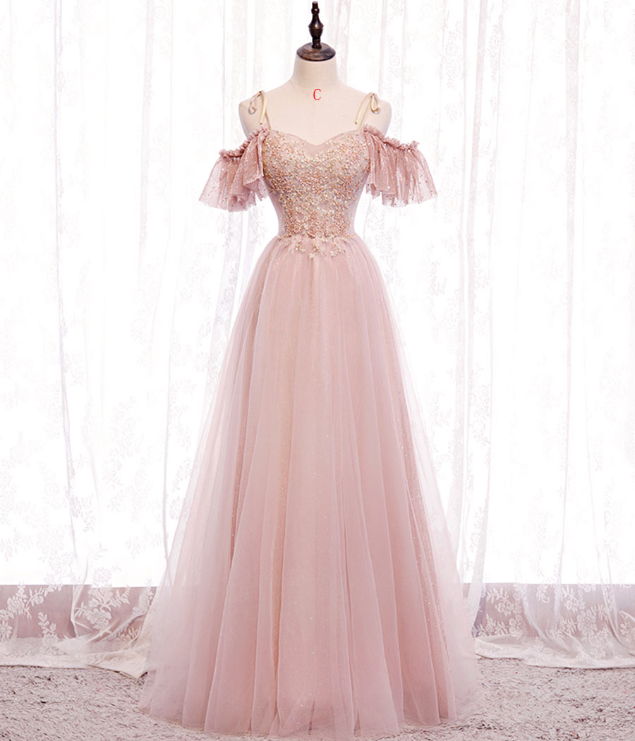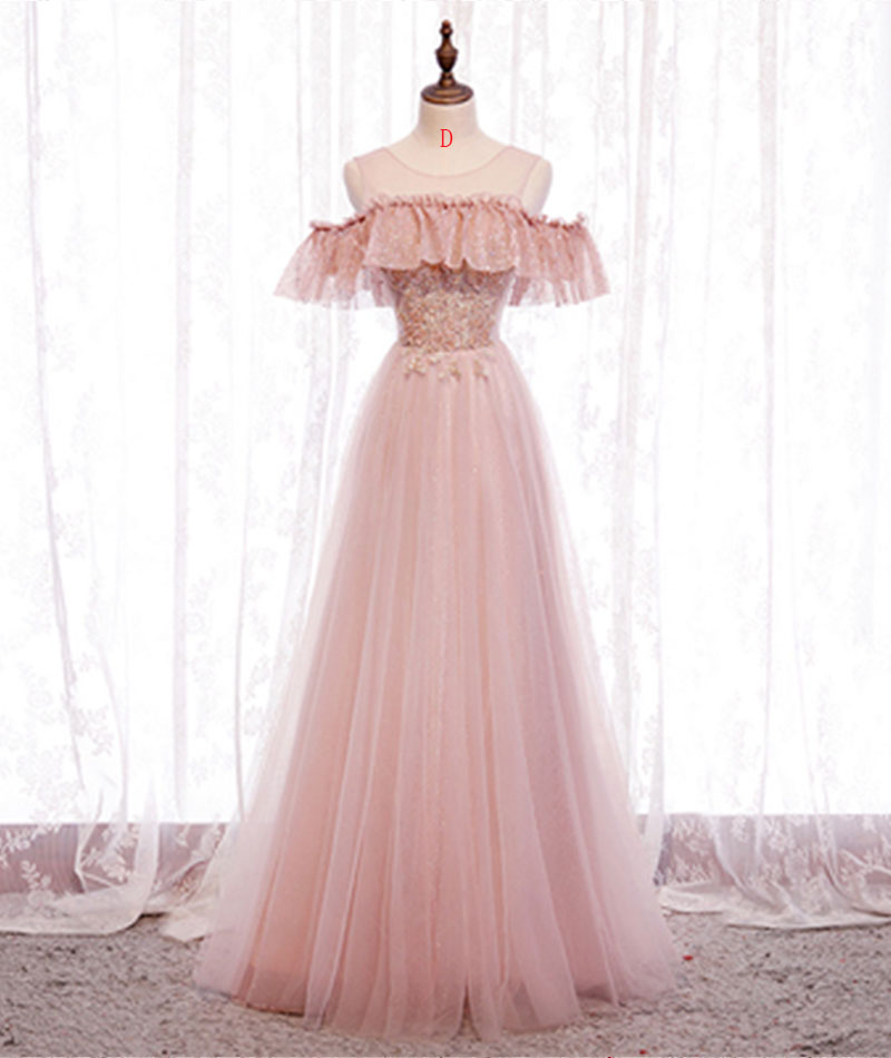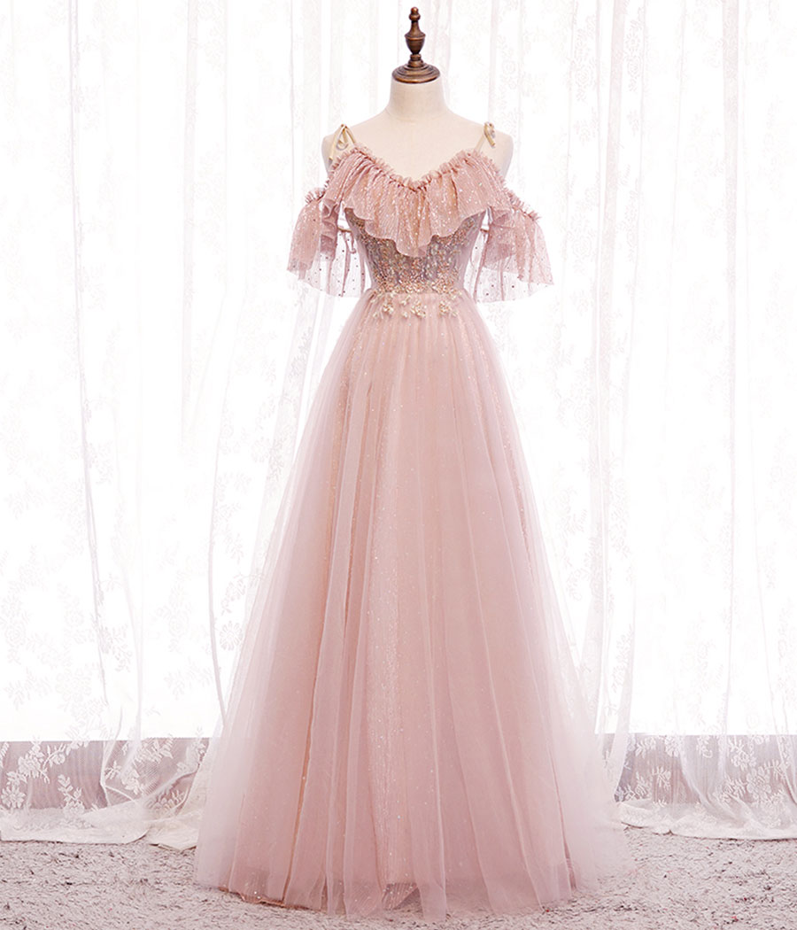 - Pink tulle lace long prom dress evening dress -
