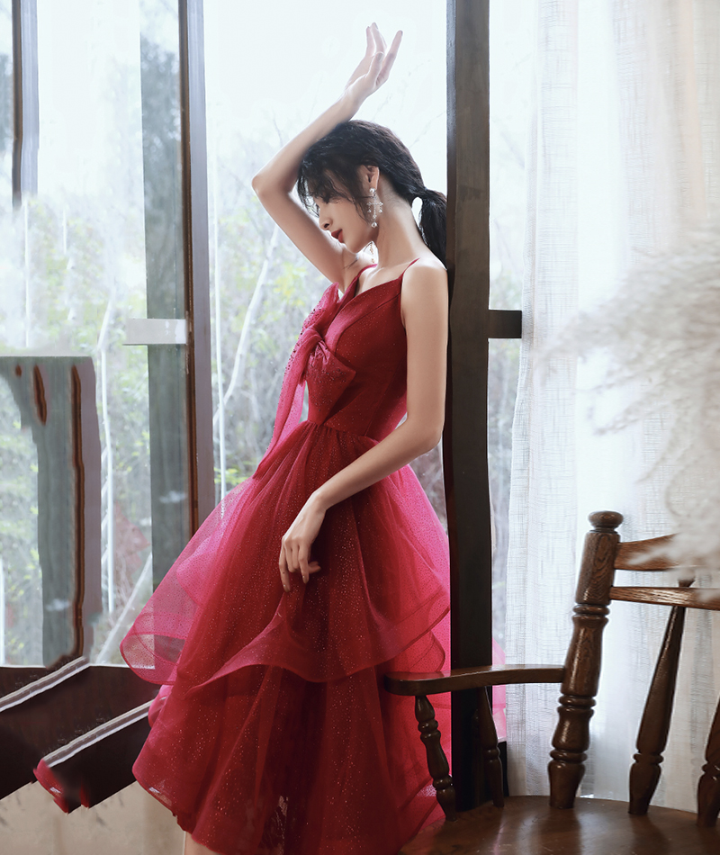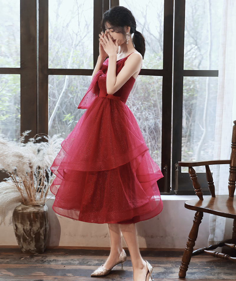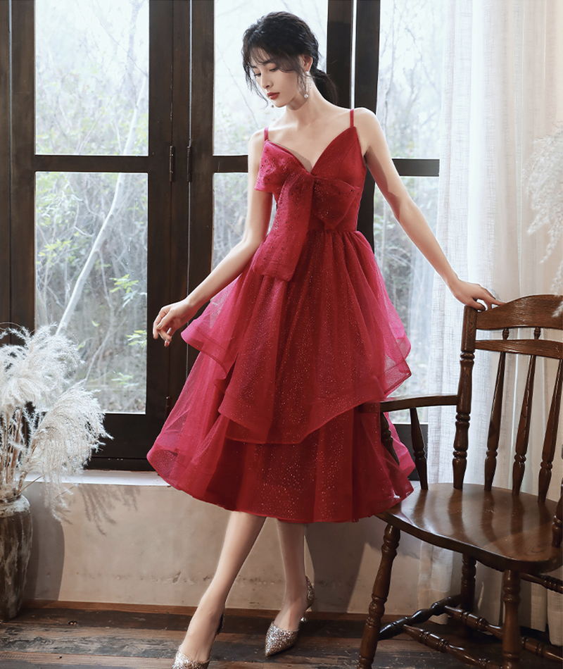 - Burgundy v neck tulle sequins prom dress homecoming dress -