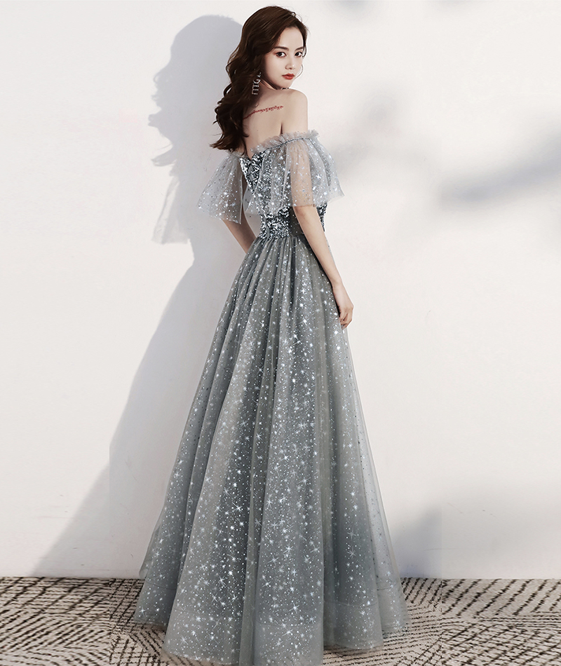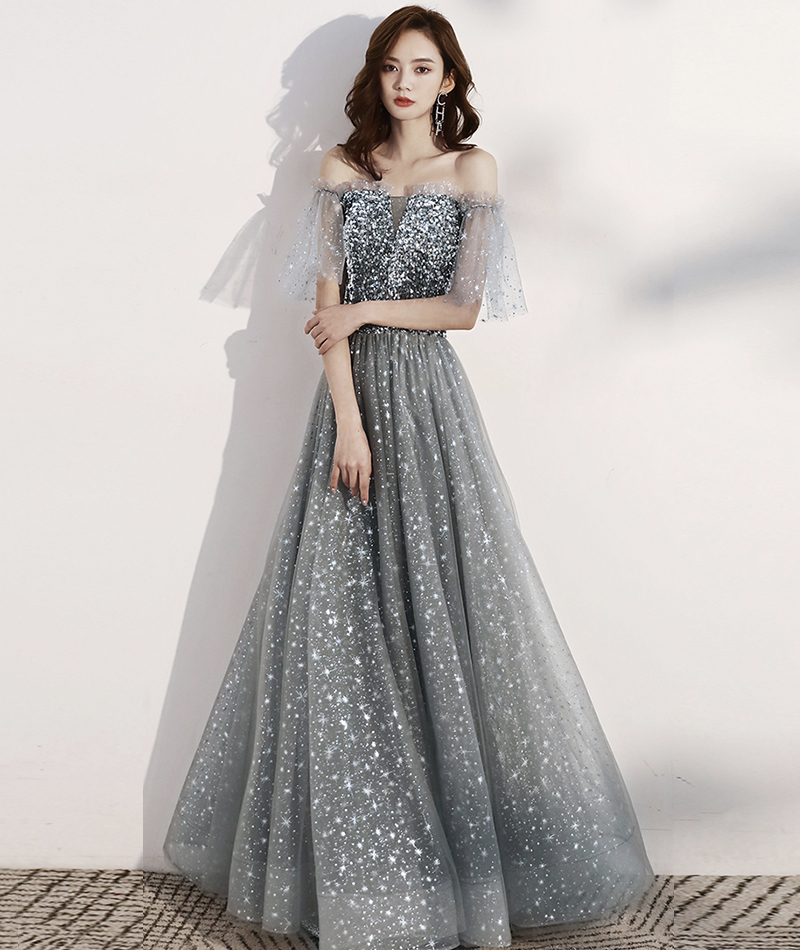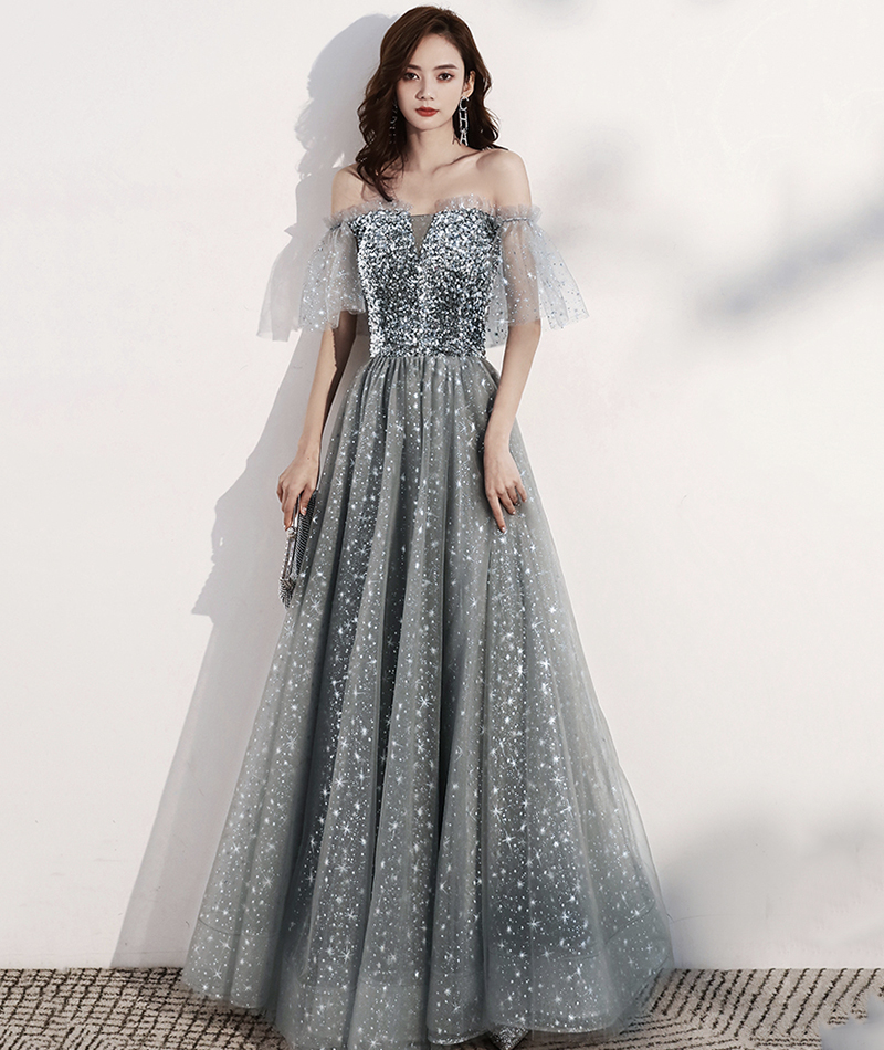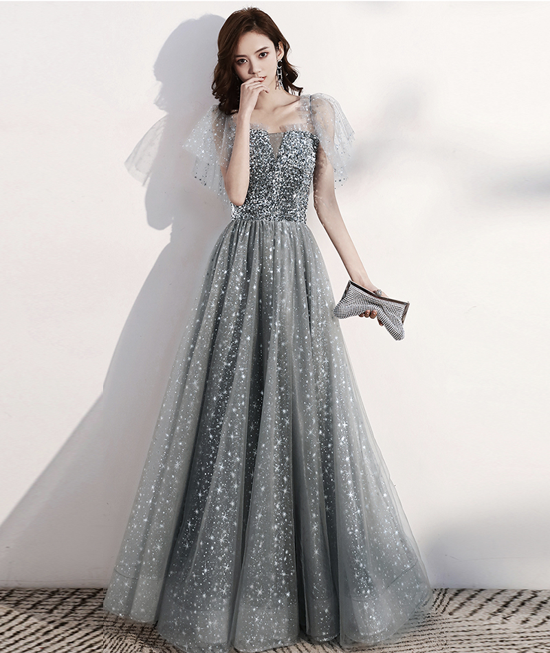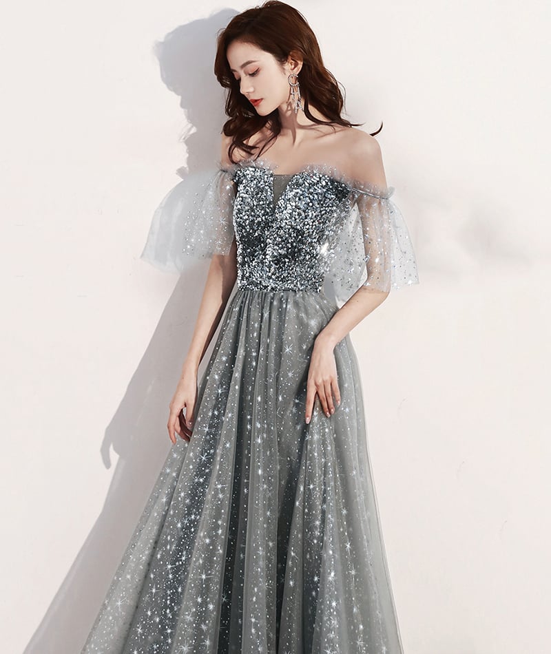 - Shiny tulle long prom dress with sequins gray evening dress -