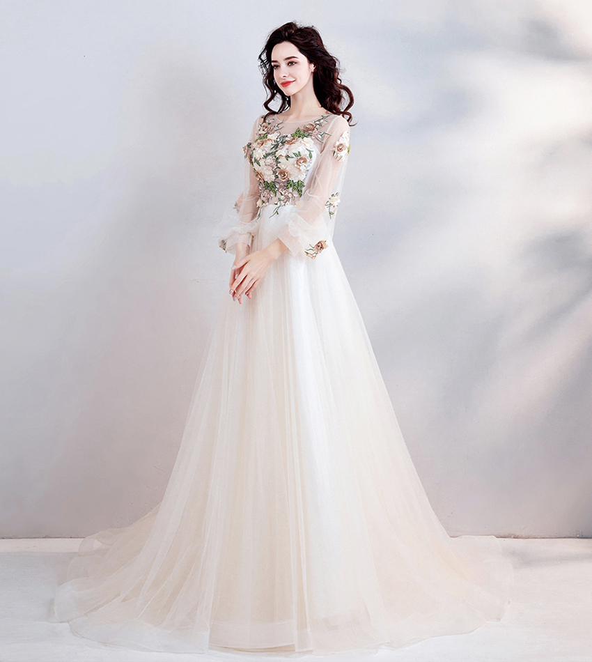 - Light champagne lace long prom dress evening dress -