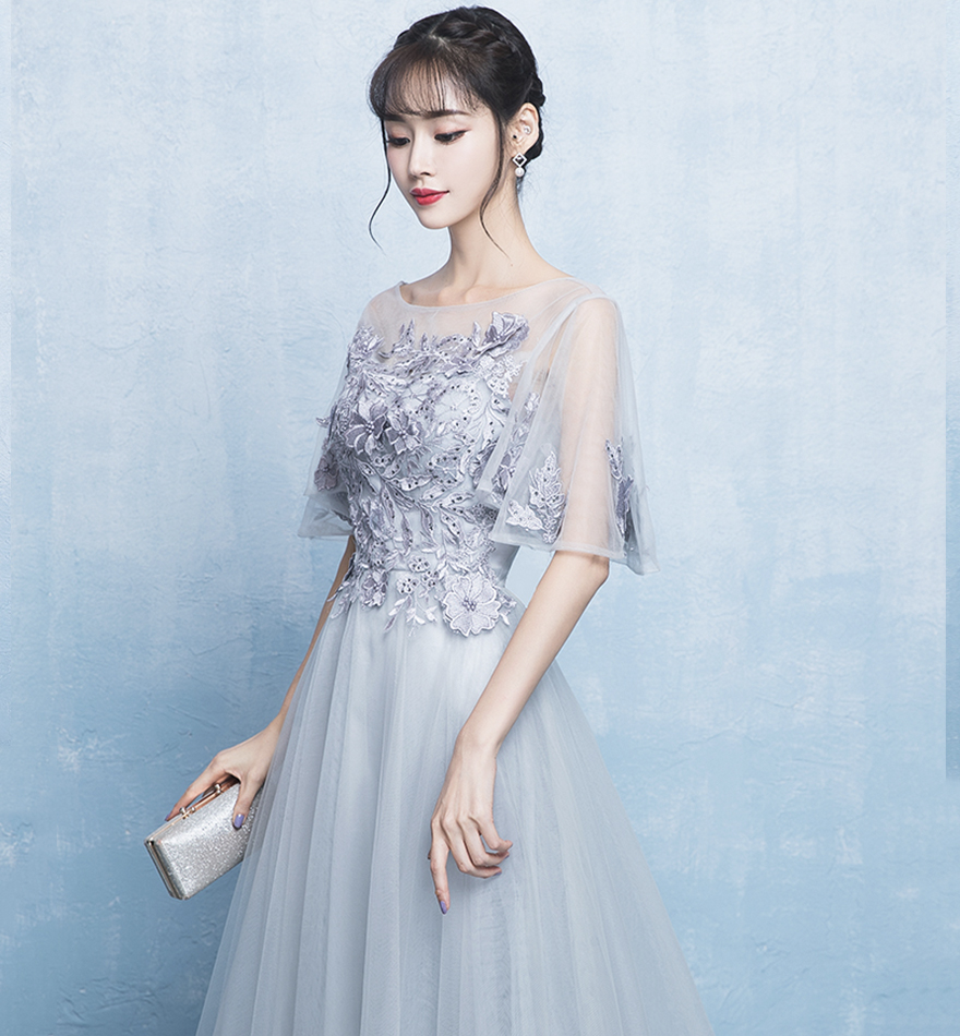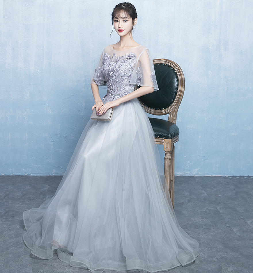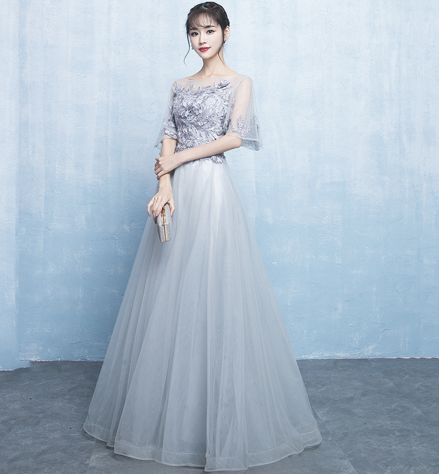 - Gray tulle lace long prom dress evening dress -