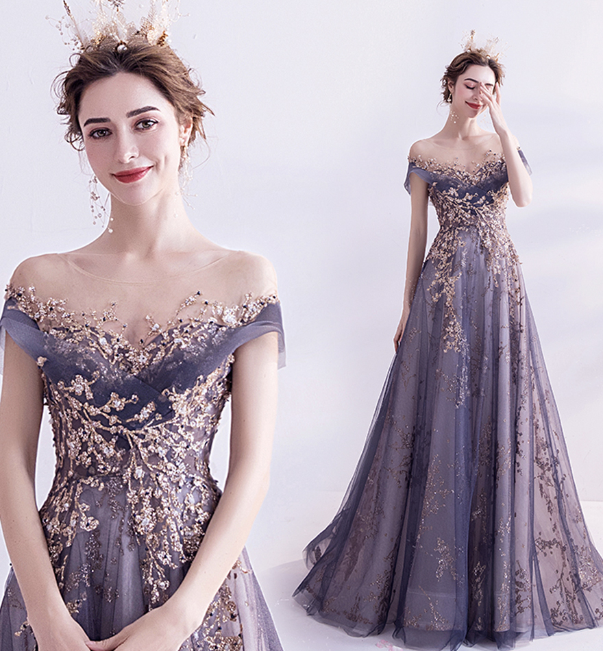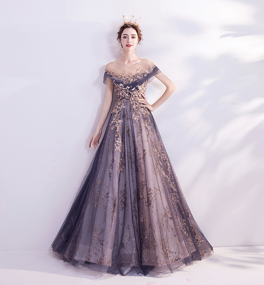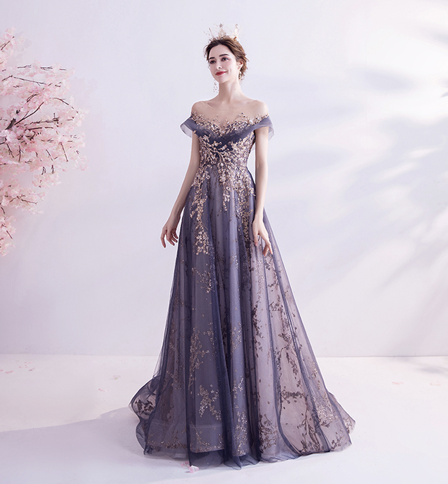 Purple tulle sequins long prom dress evening dress