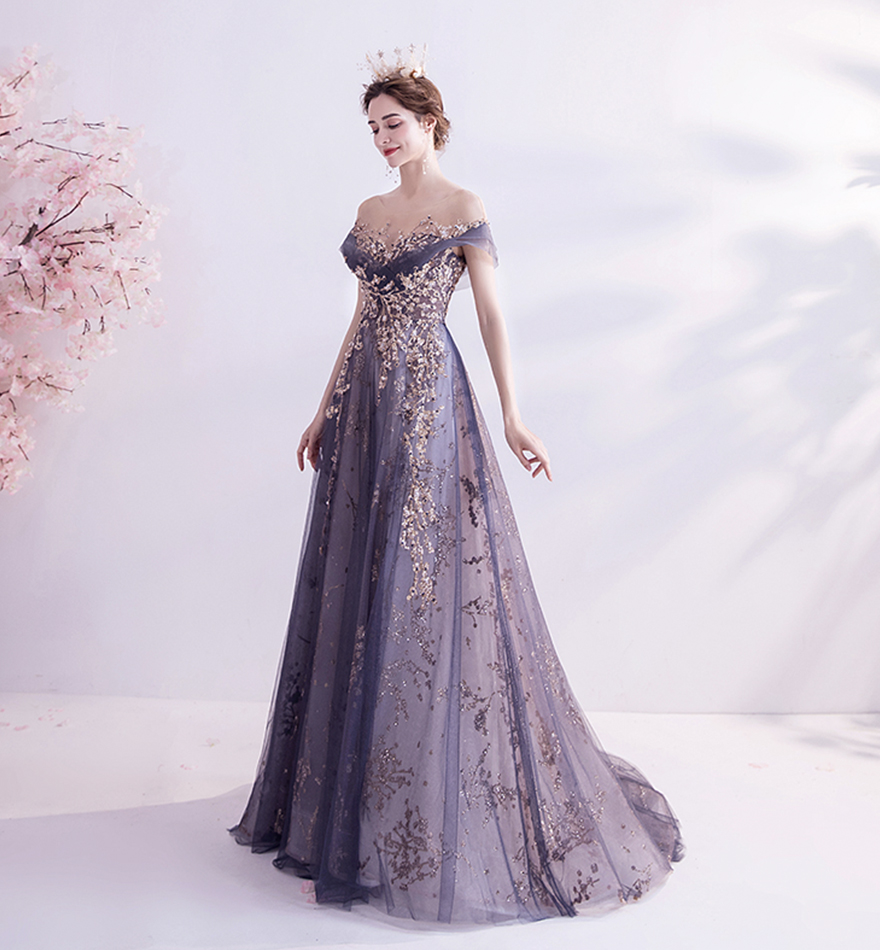 - Purple tulle sequins long prom dress evening dress -